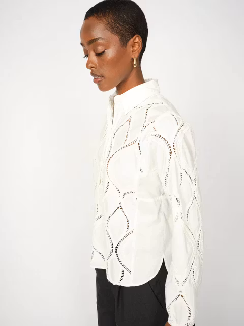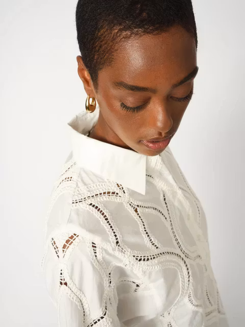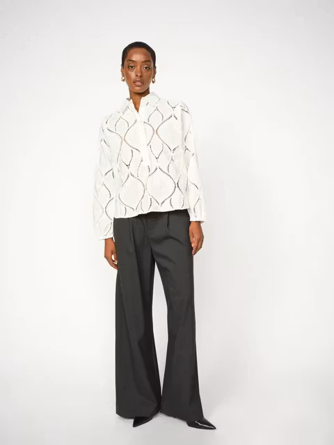 Denna tidlösa spetsblus är designad med en elegant silhuett, komplett med en klassisk krage och en förfinad knappslå för en polerad finish. Det intrikata spetsmaterialet förstärks av elastiska ärmar, vilket ger både komfort och en delikat, feminin känsla. Perfekt för alla tillfällen, styla den med skräddarsydda byxor för en sofistikerad look eller kombinera den med denim för en avslappnat chic ensemble.