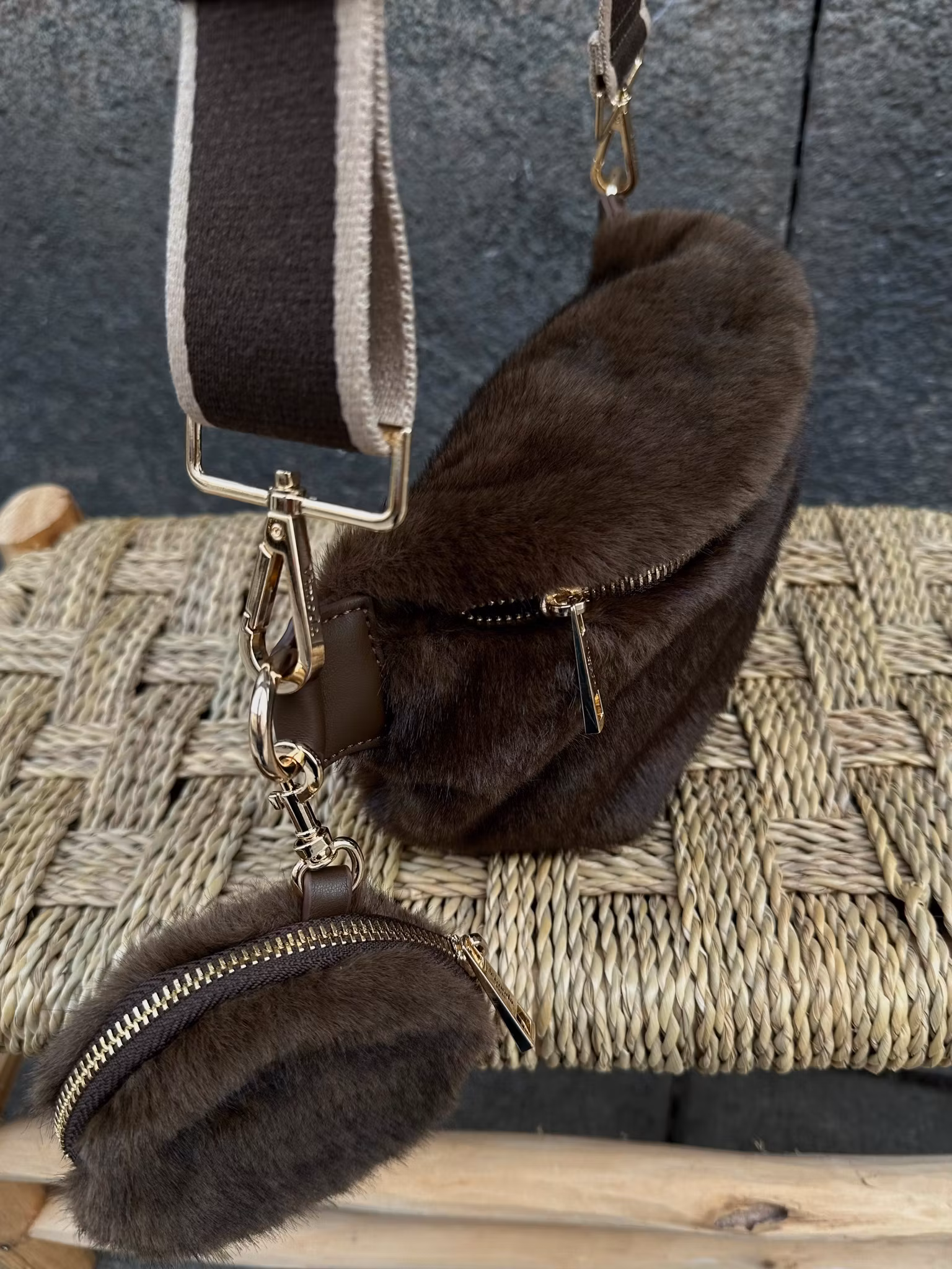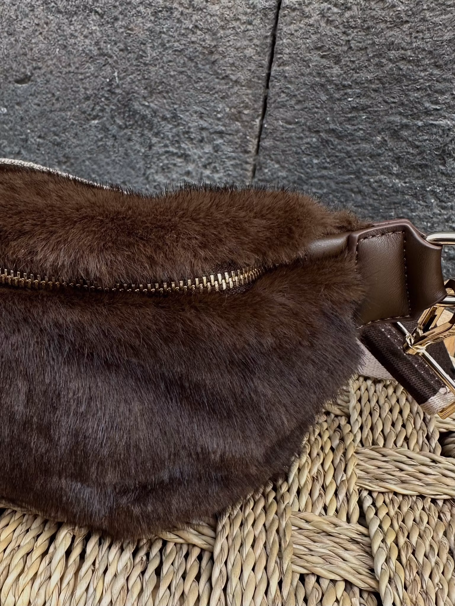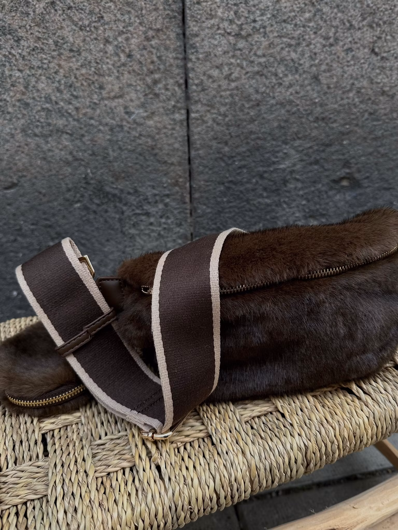 Fejk päls väska i bumbag modell, skinnimitation, justerbart band och detalj att hänga på.