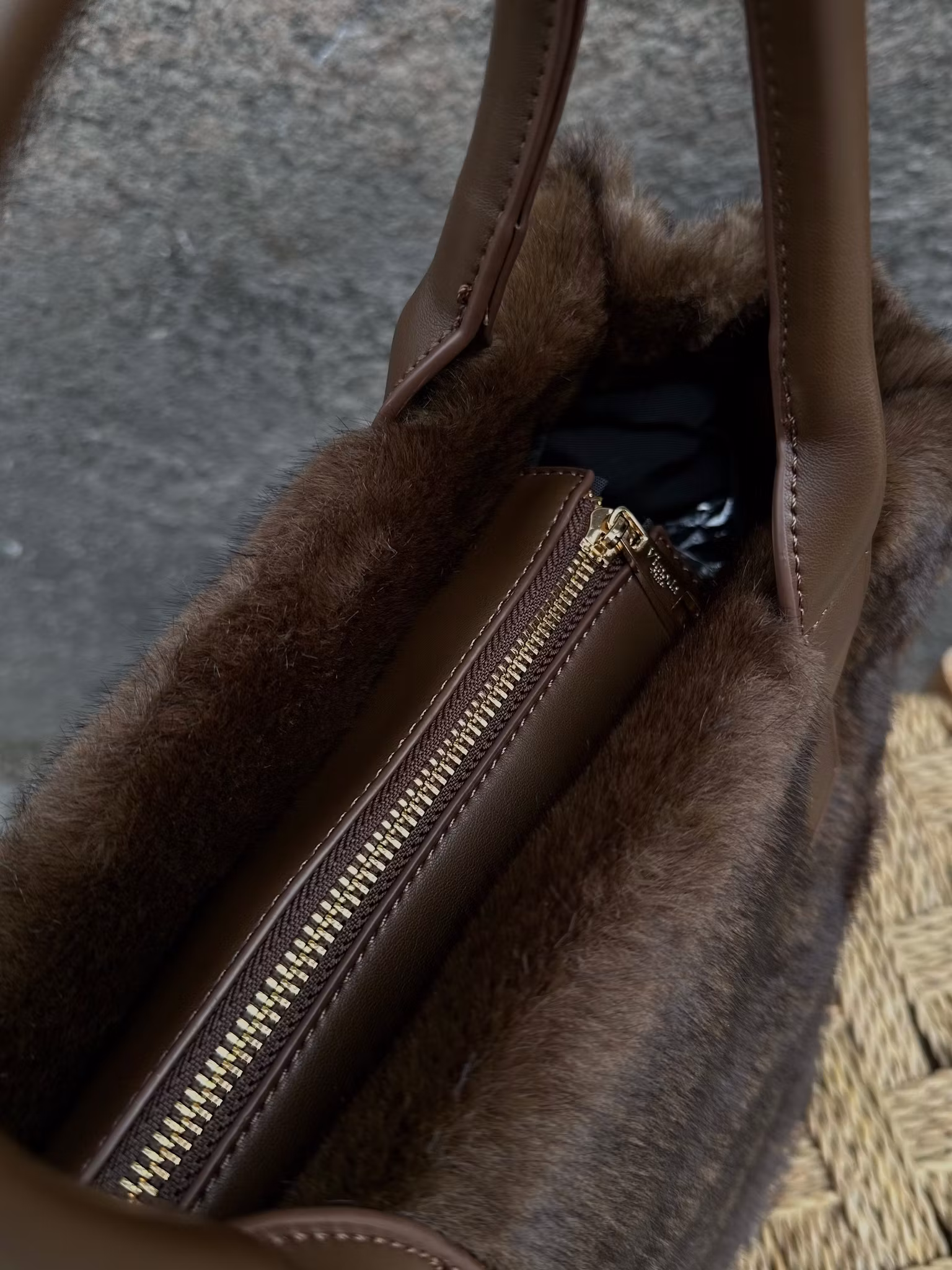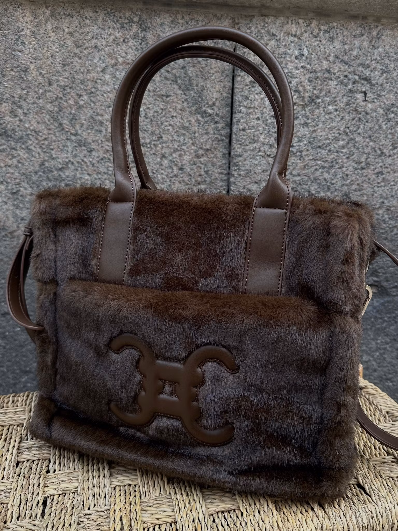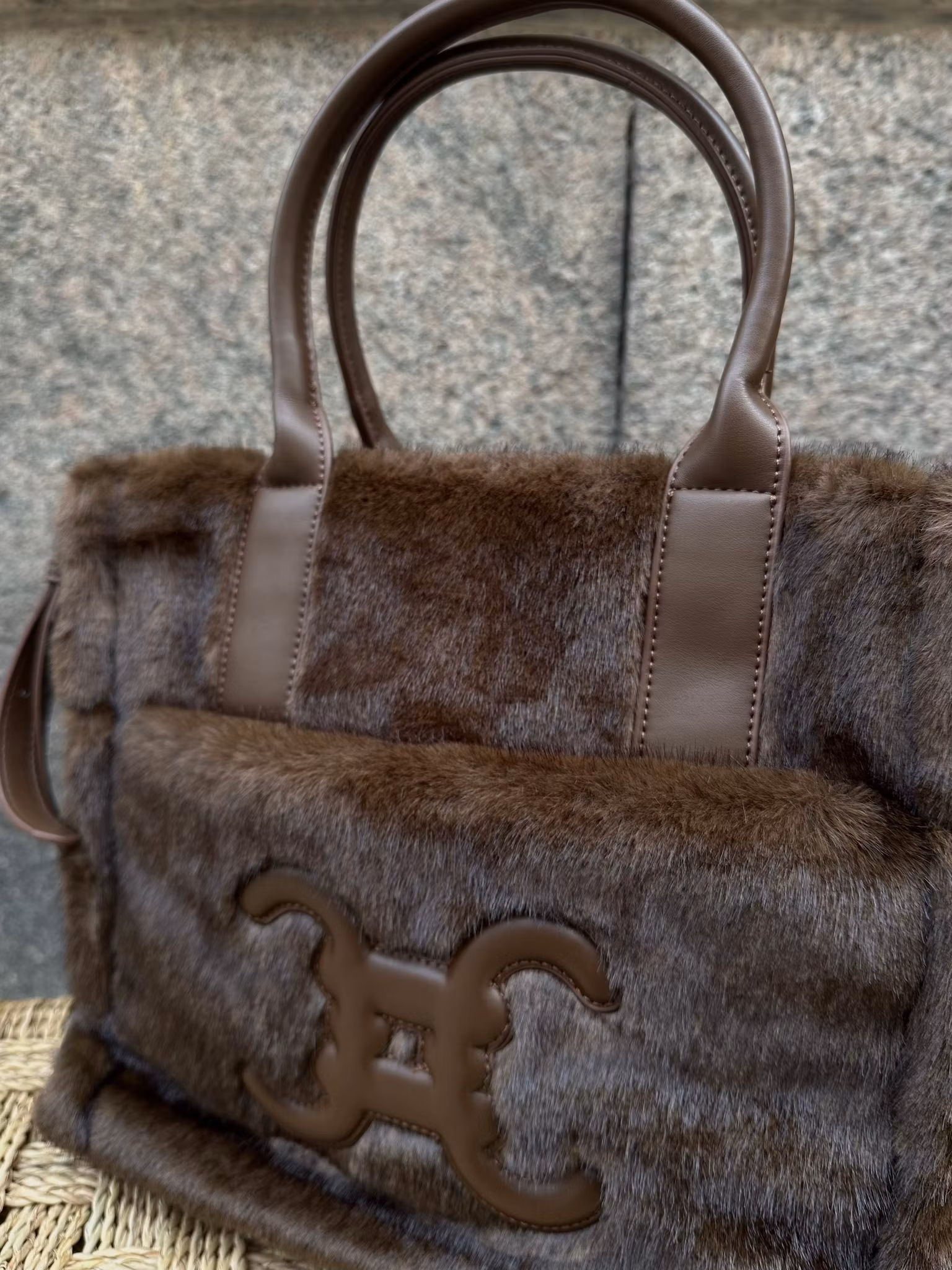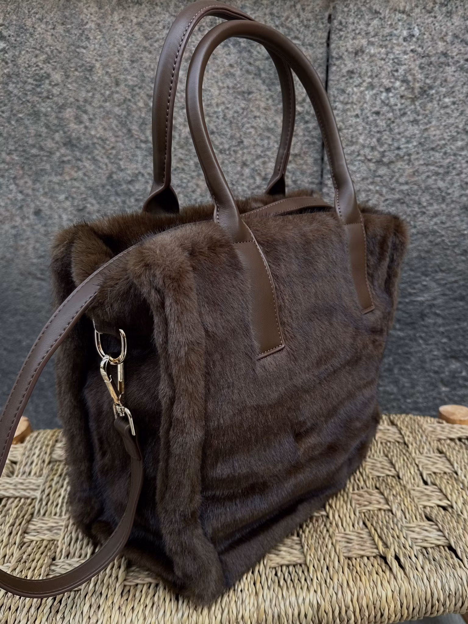 Gosig fejk päls väska med logga fram med dolt fack. Skinnimitation, blixtlås, justerbart band.