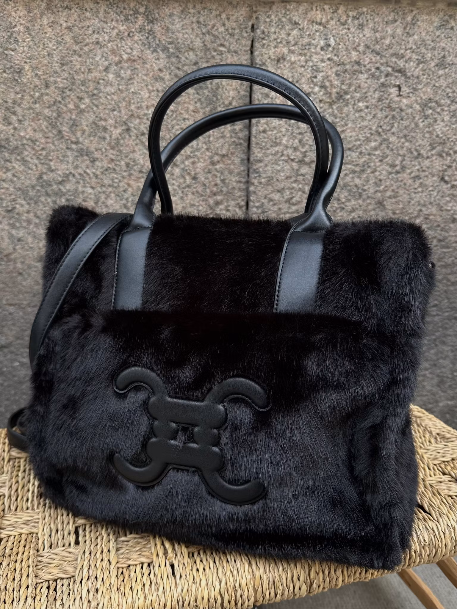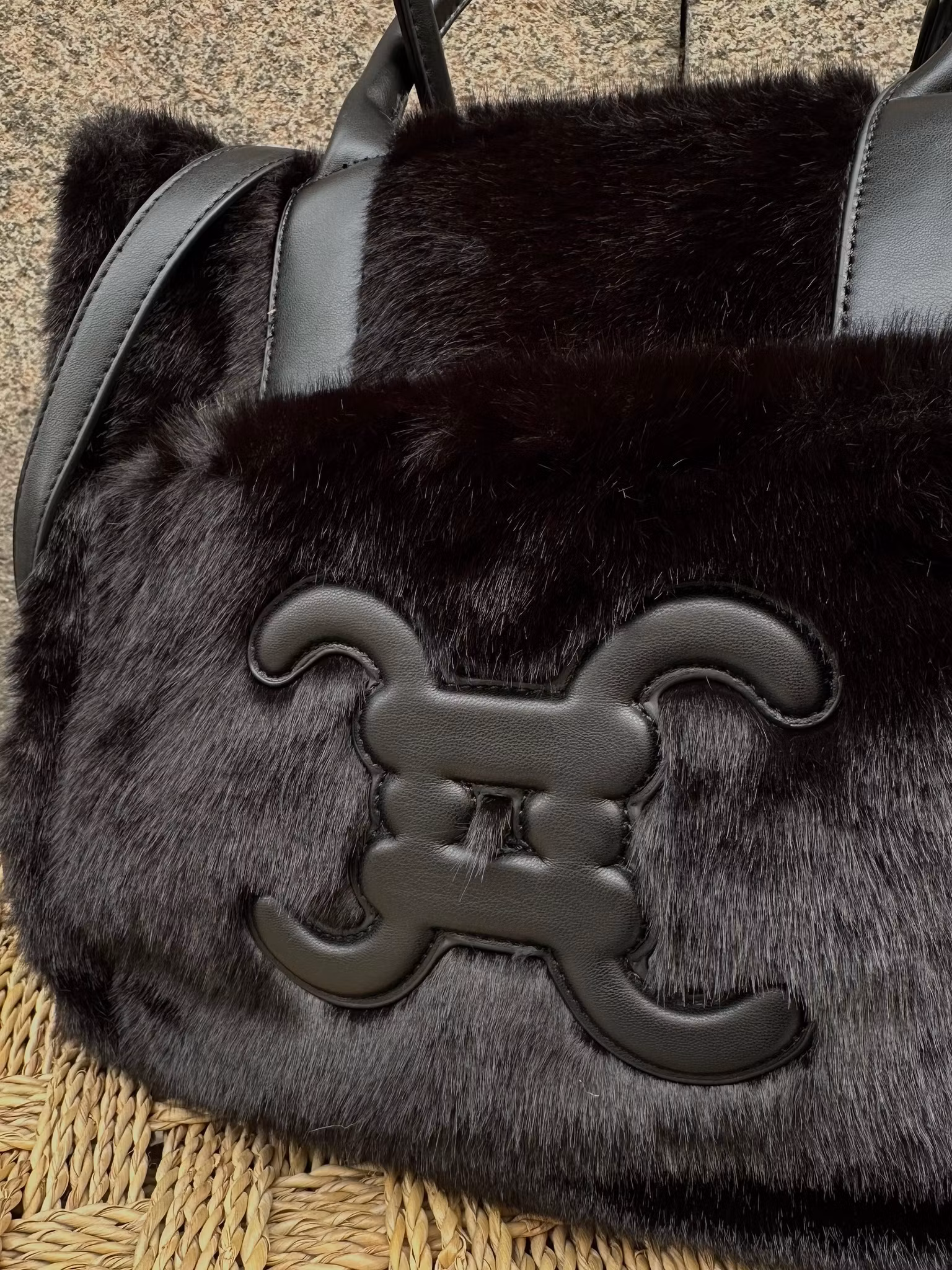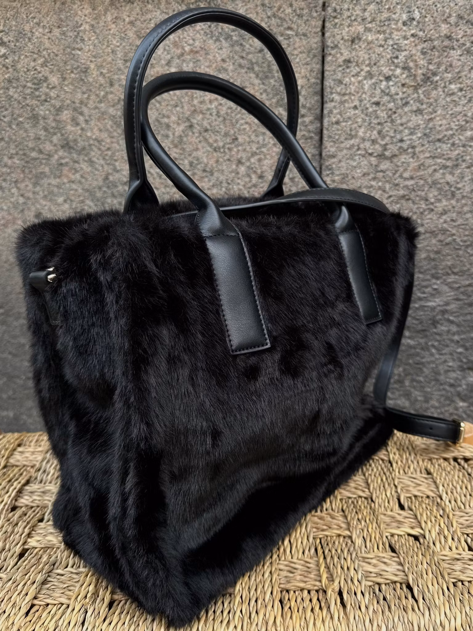 Gosig fejk päls väska med logga fram med dolt fack. Skinnimitation, blixtlås, justerbart band.