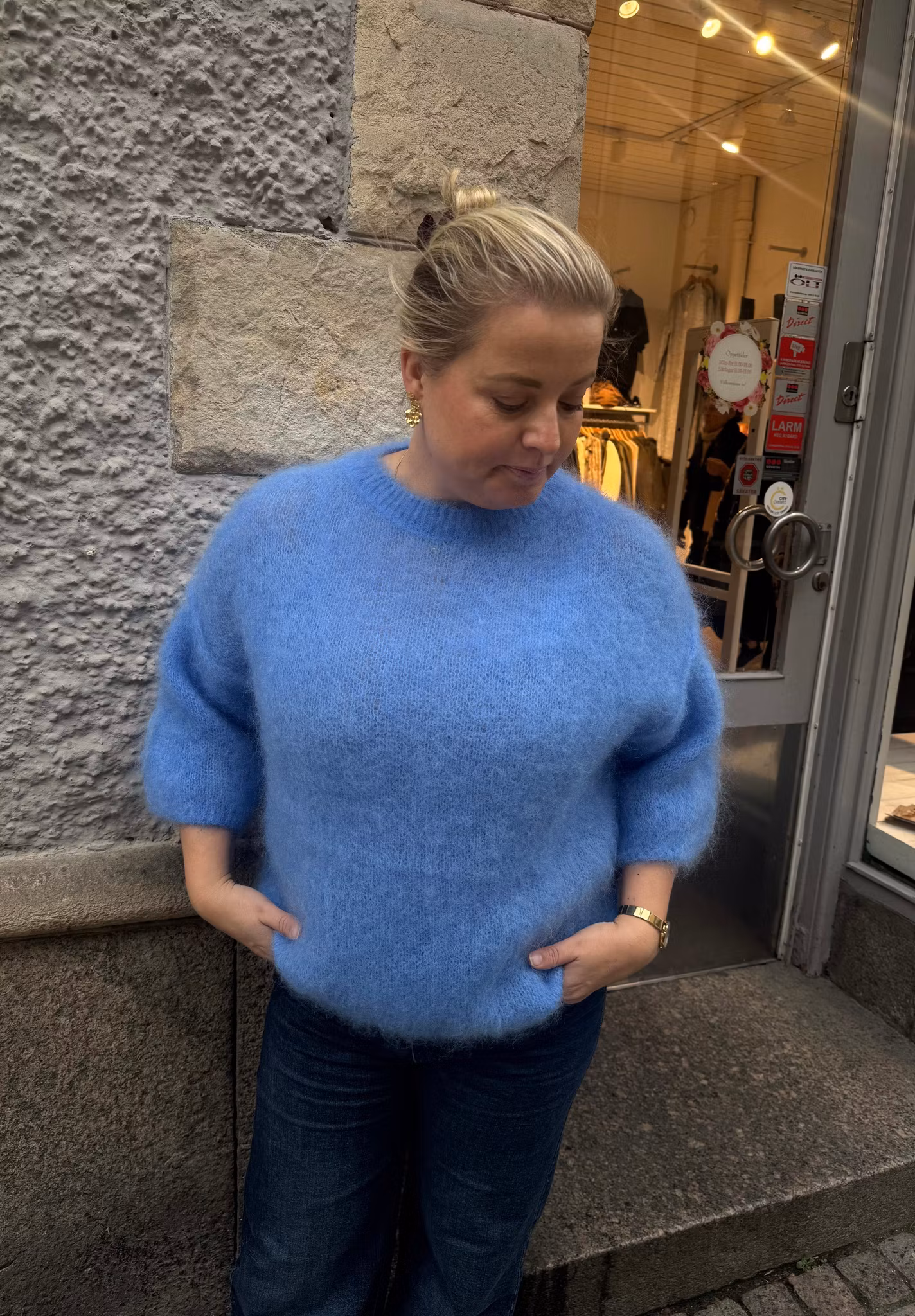 Gosig mohair tröja med rundhals och 3/4 ärm. Onesize, passar storlekar 34-42.