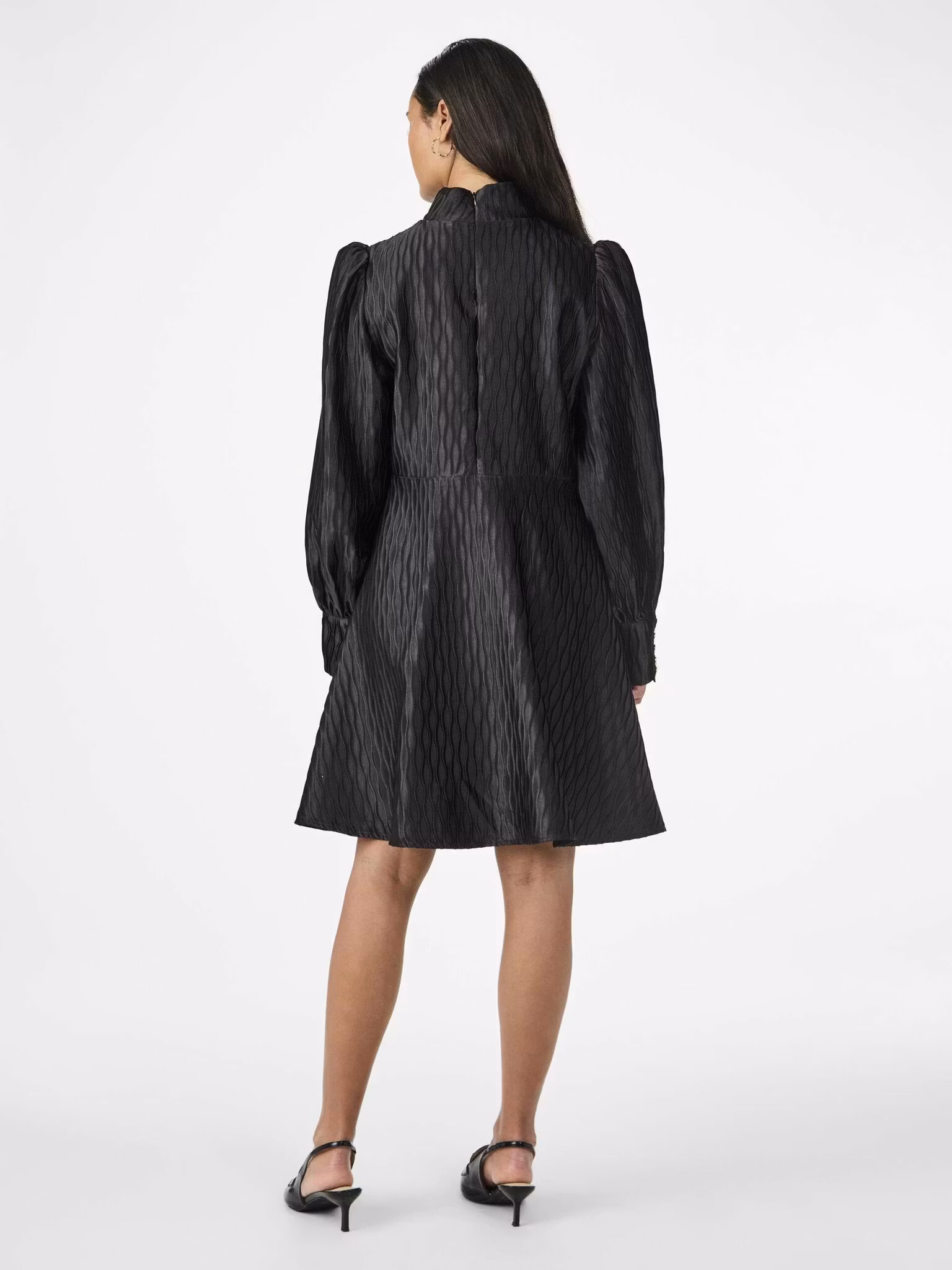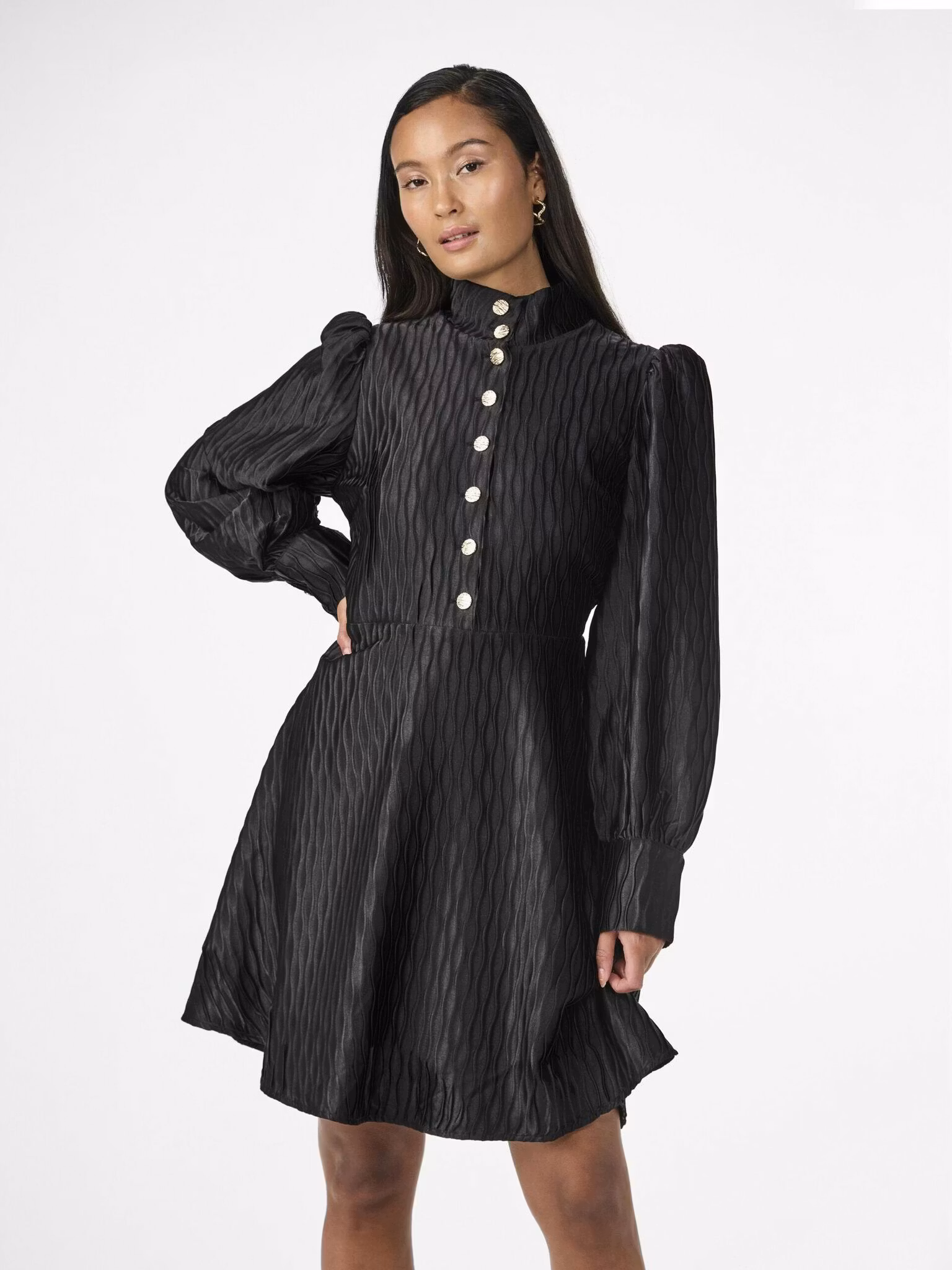 Miniklänning med hög krage och guldknappar. Dold dragkedja på baksidan.