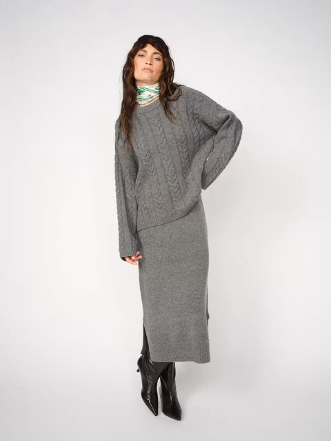 Denna tidlösa rundhalsade stickade tröja är tillverkad av mjuk ull, vilket ger både värme och komfort i en vanlig passform. De fina kabelstickade detaljerna ger djup och sofistikering, vilket gör den till en förfinad vardagsfavorit. Oavsett om den bärs i lager eller ensam, är denna stickade tröja ett mångsidigt måste för en enkel och stilren look.