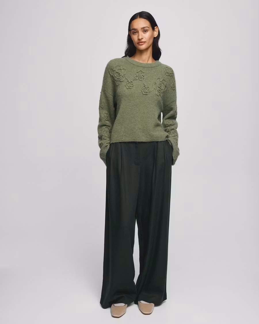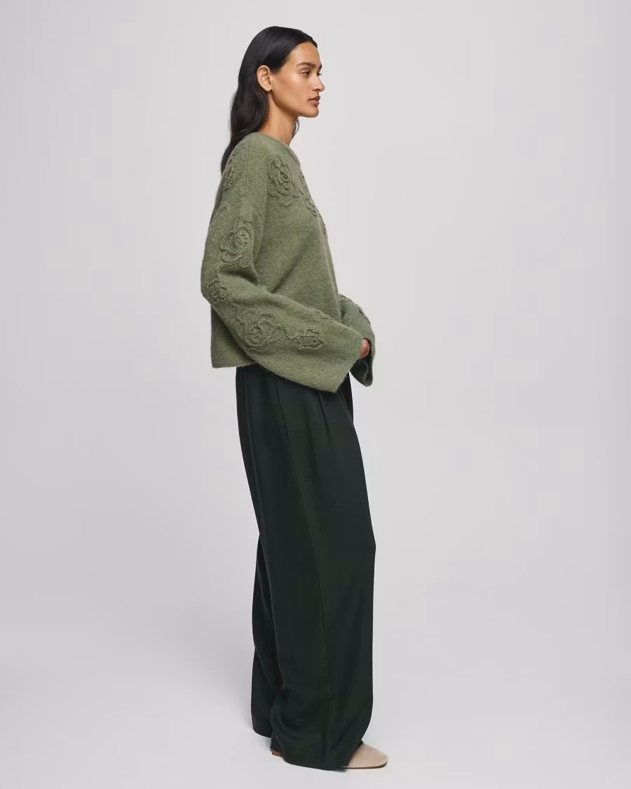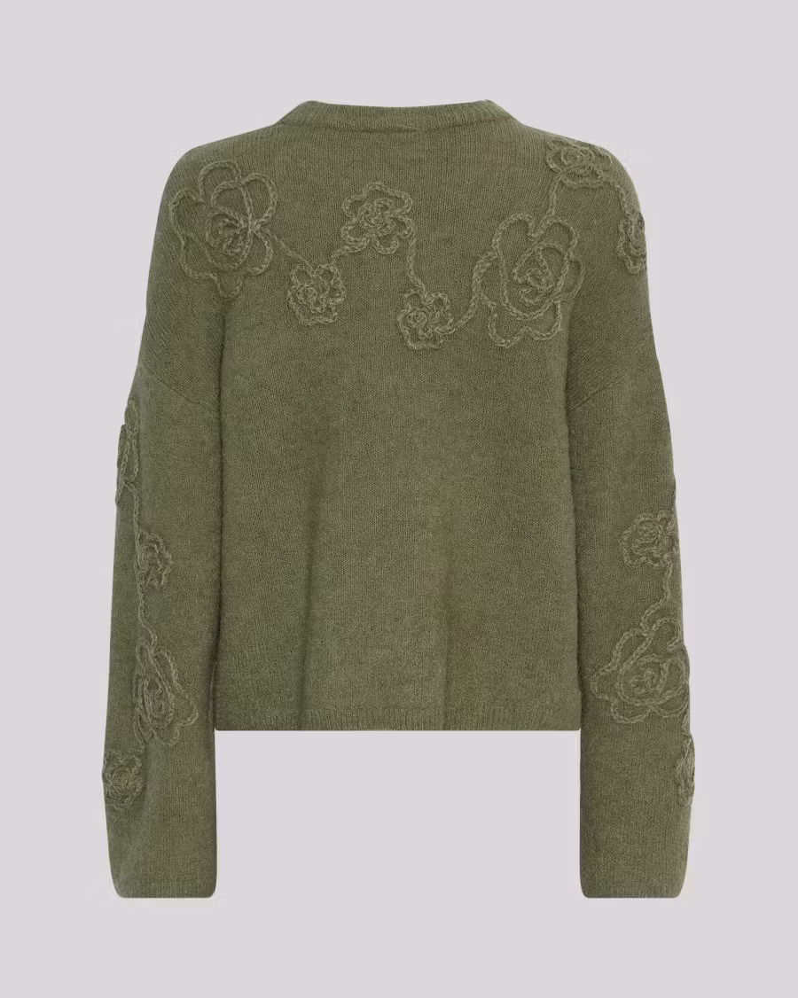 Stickad tröja med boxig modell, broderade blommor, långa/vida ärmar och rundhals.