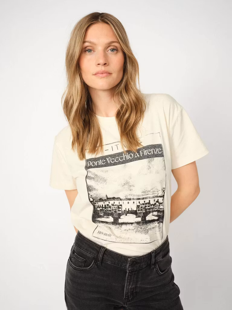 Denna tidlösa t-shirt är designad med en klassisk O-hals och korta ärmar, vilket garanterar en bekväm och avslappnad passform. En djärv tryck på framsidan ger en modern kant, vilket gör den till ett statement-plagg i varje avslappnad garderob. Styla den med jeans för en avslappnad vardagslook eller bär den under en blazer för en cool och modern stil.
