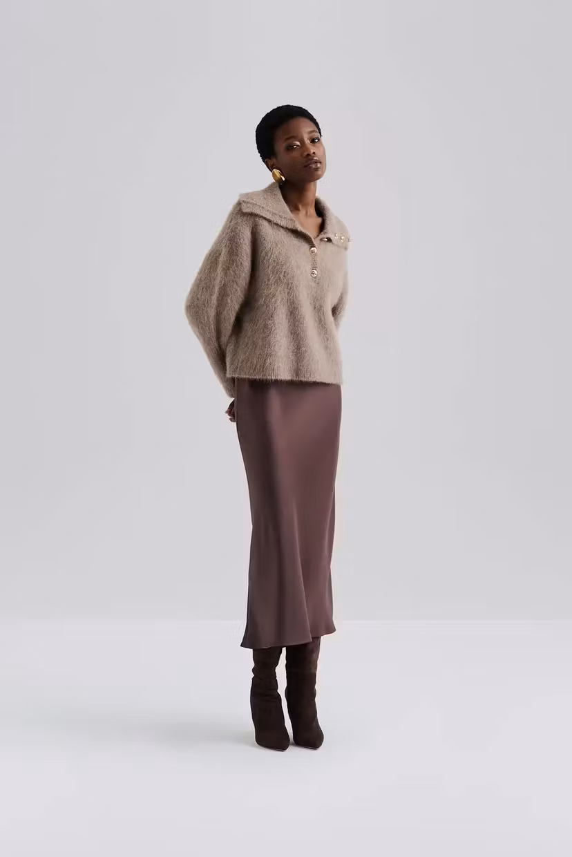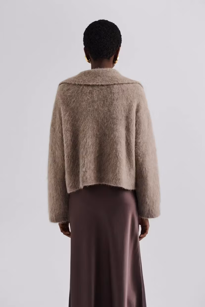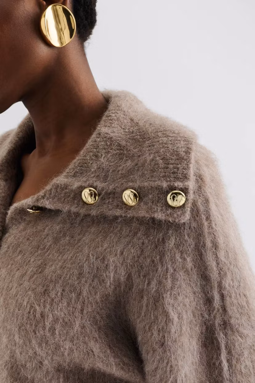 Tröja i en alpackablandning med nedvikt krage och guldknappar med Malina-monogram.