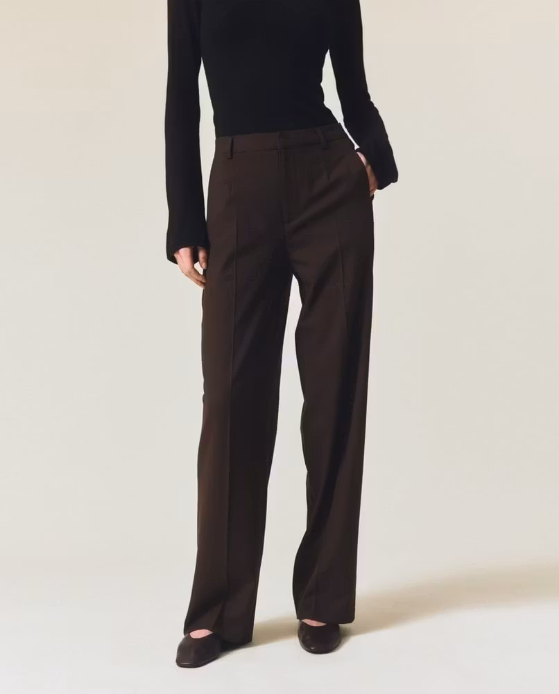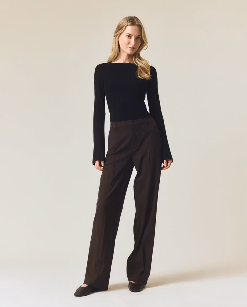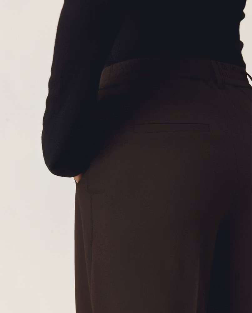 Högmidjad med raka, vida ben med pressade veck både fram och bak. Elastisk midja bak.