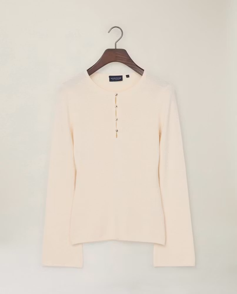 Figursydd med trumpetärm, små guldknappar fram och rundhals.