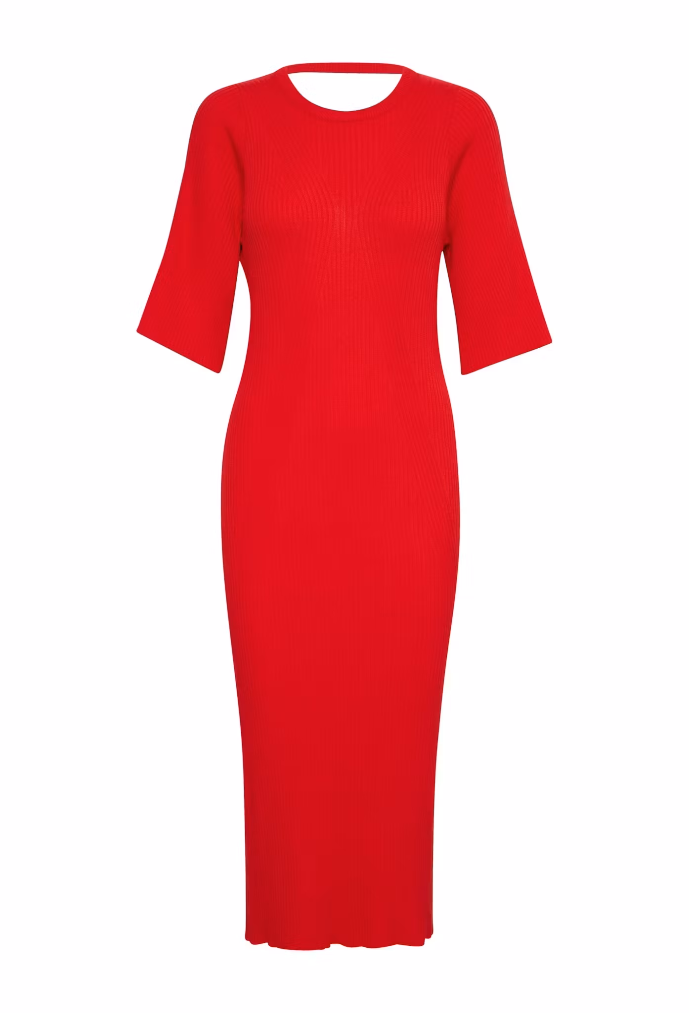 Ribbad figurnära klänning med 3/4 ärm, öppen bak i ryggen, stretchigt material.