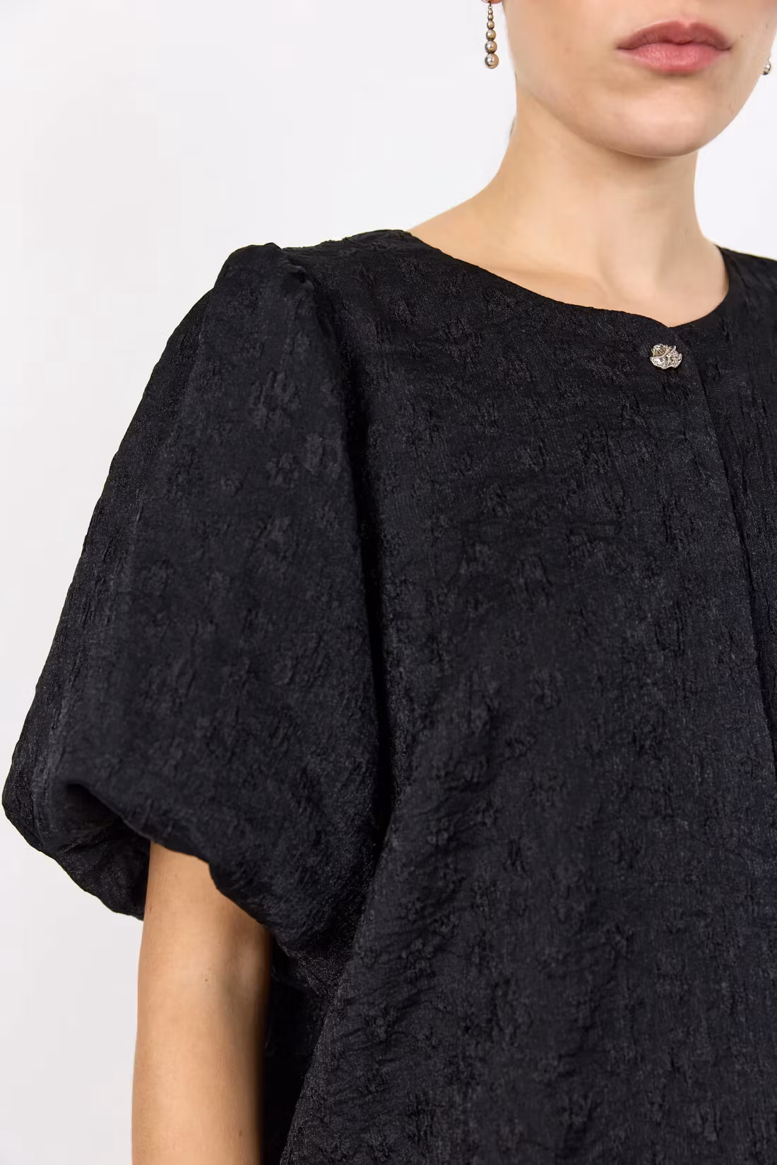 Rund halsringning, puffade korta ärmar med texturerat tyg.