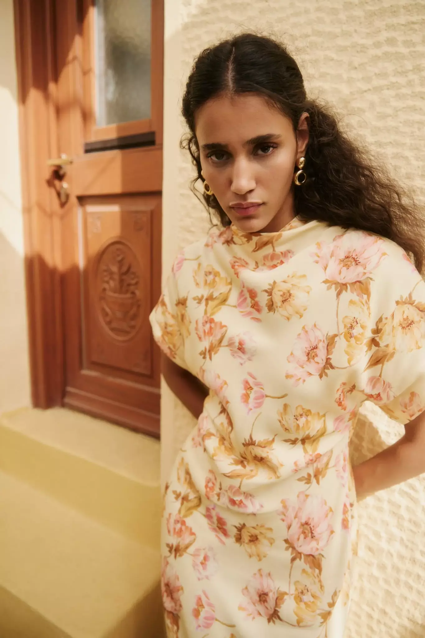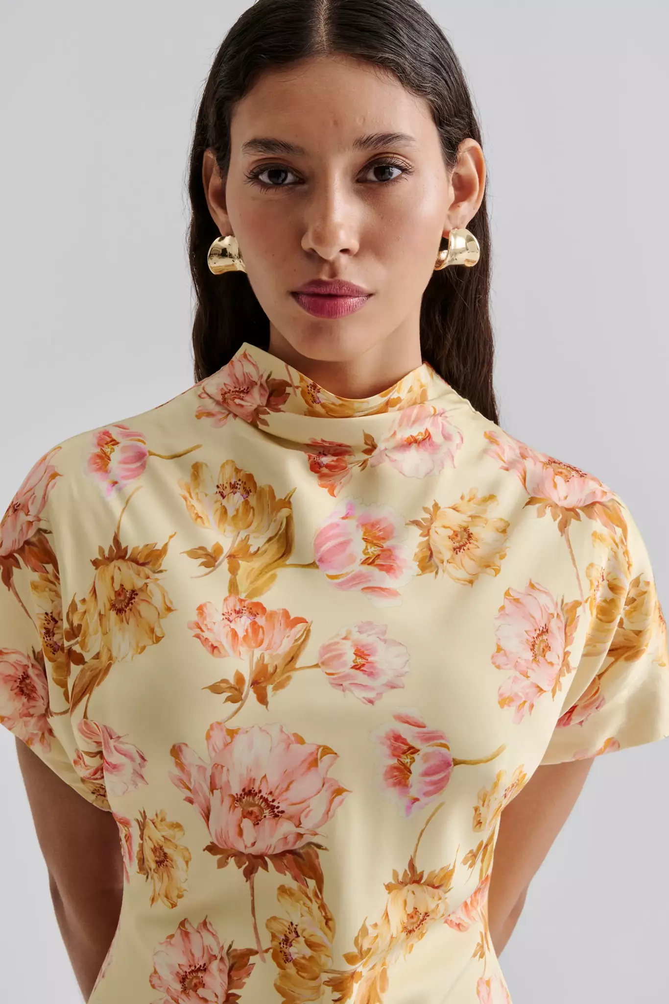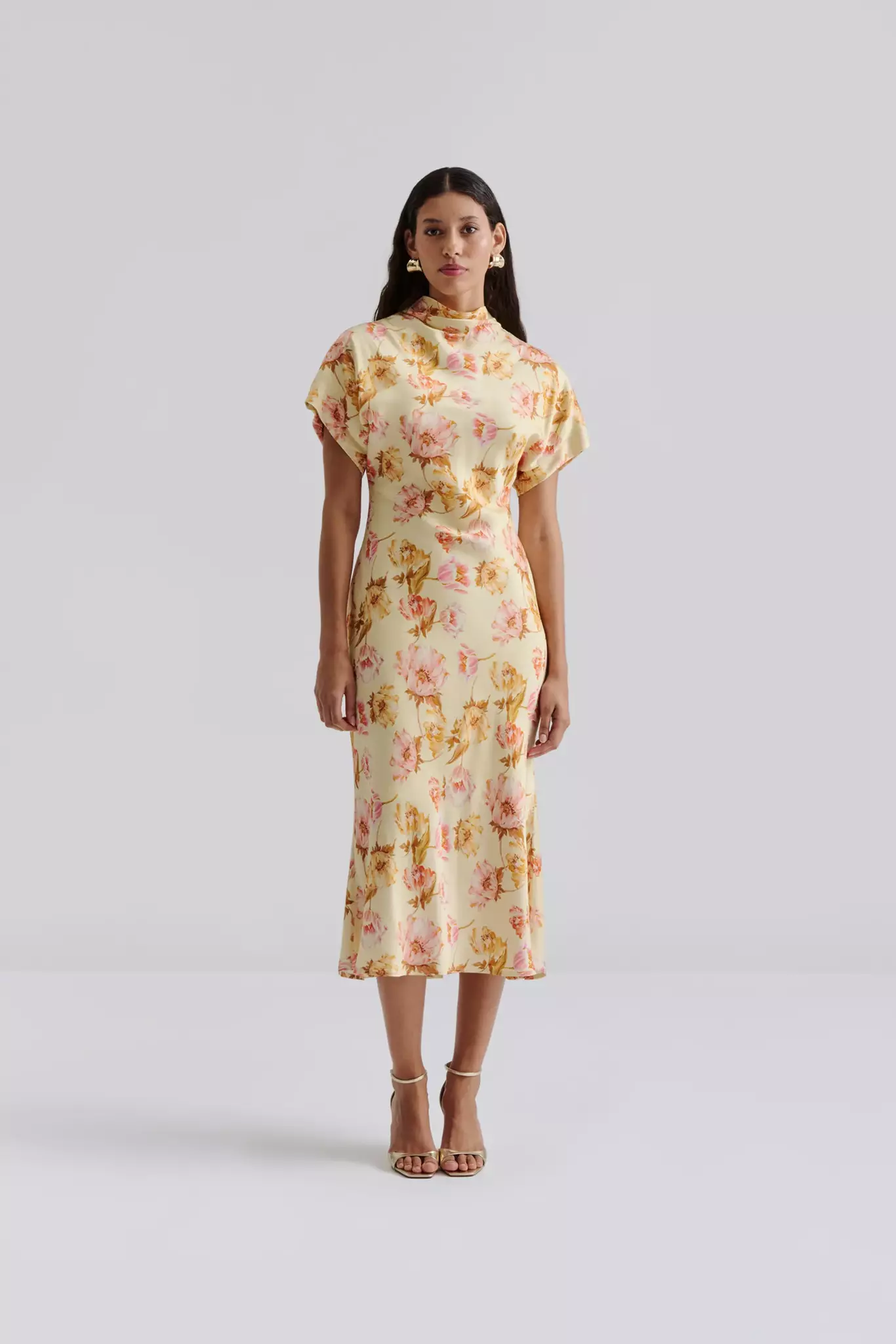 Kortärmad satin midiklänning med draperad halvpolo. Dold dragkedja i ryggen.