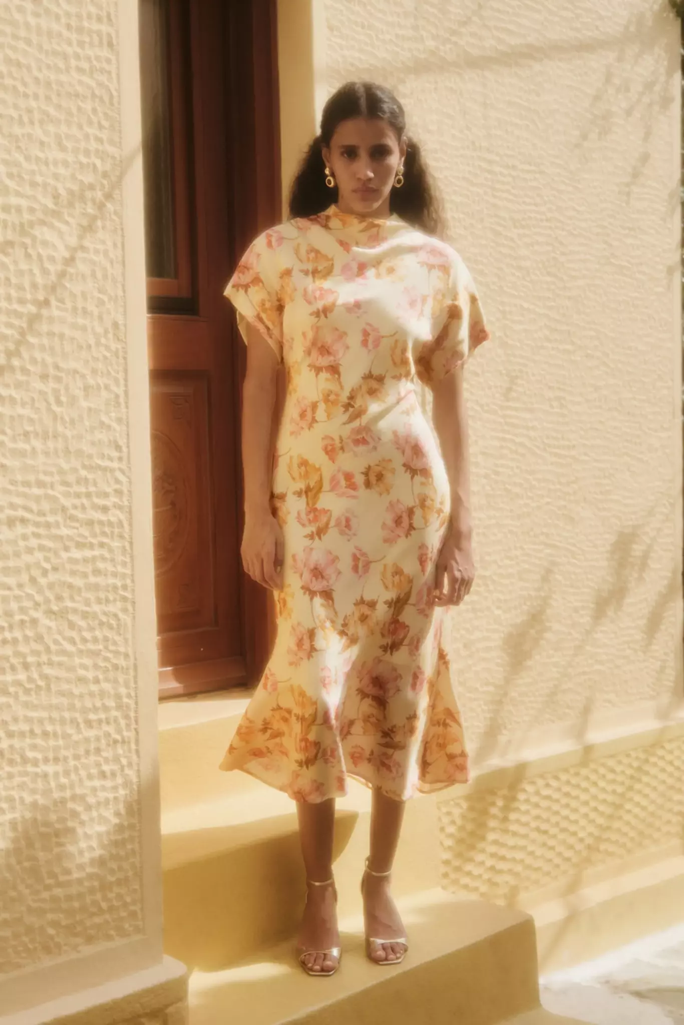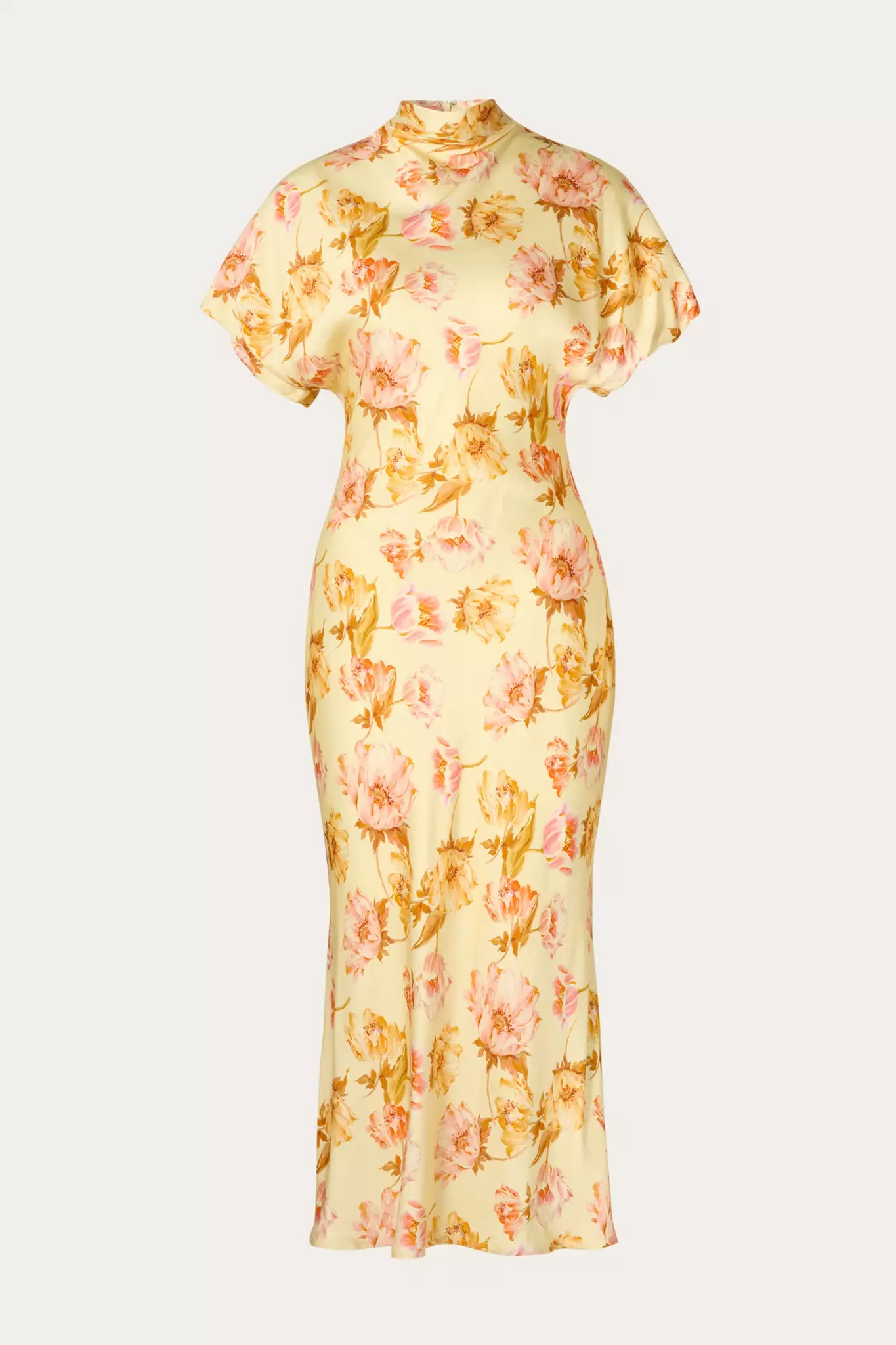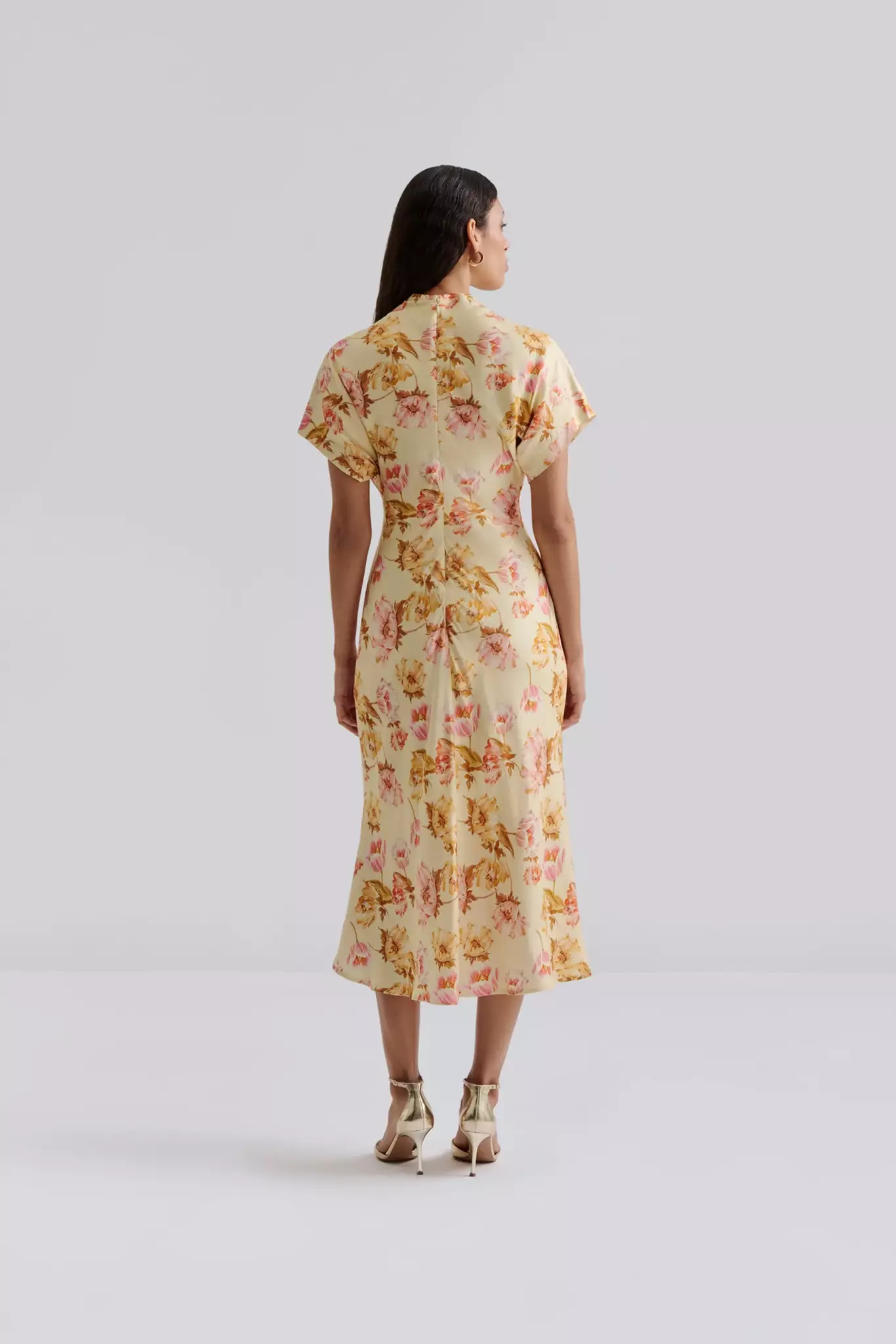 Kortärmad satin midiklänning med draperad halvpolo. Dold dragkedja i ryggen.
