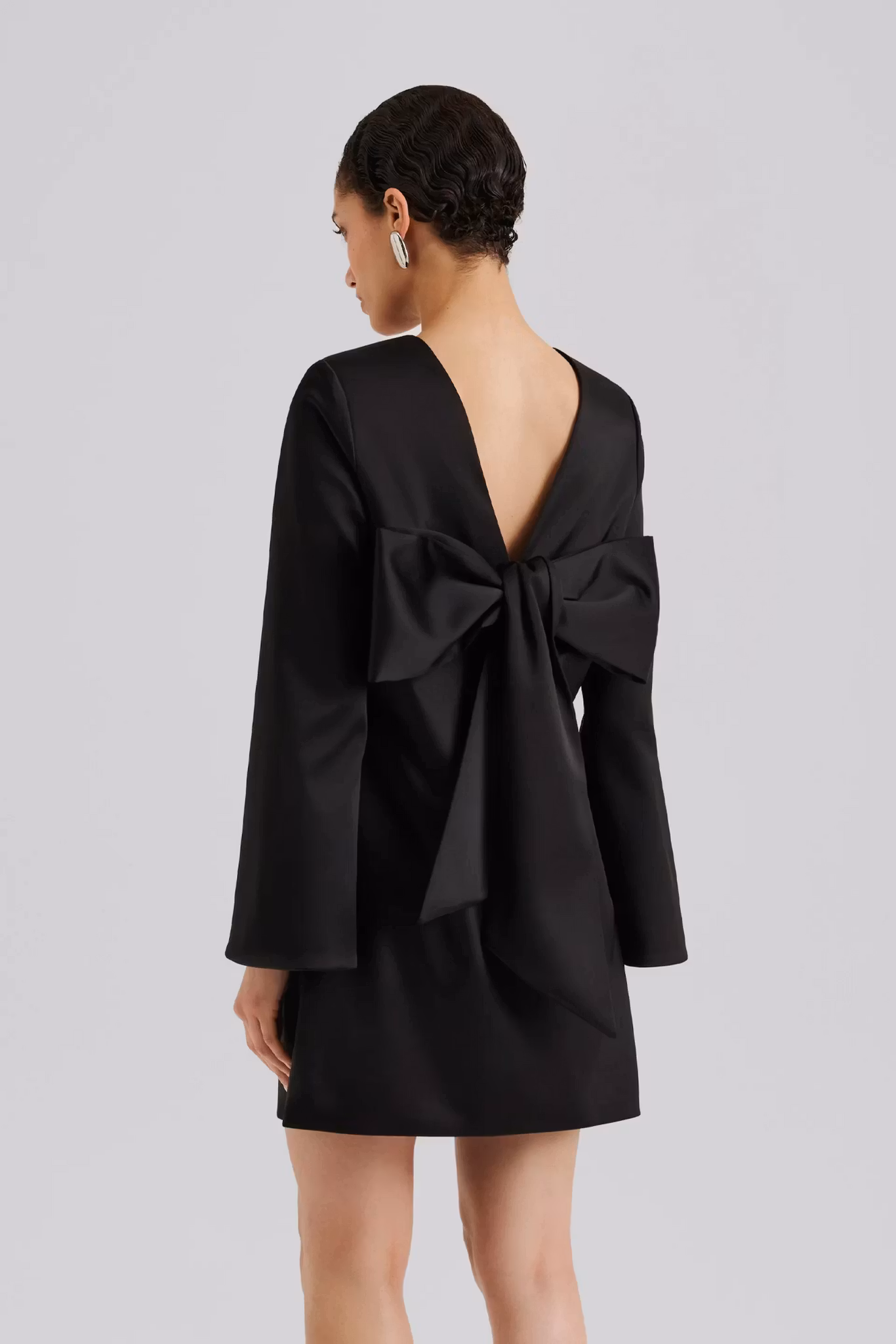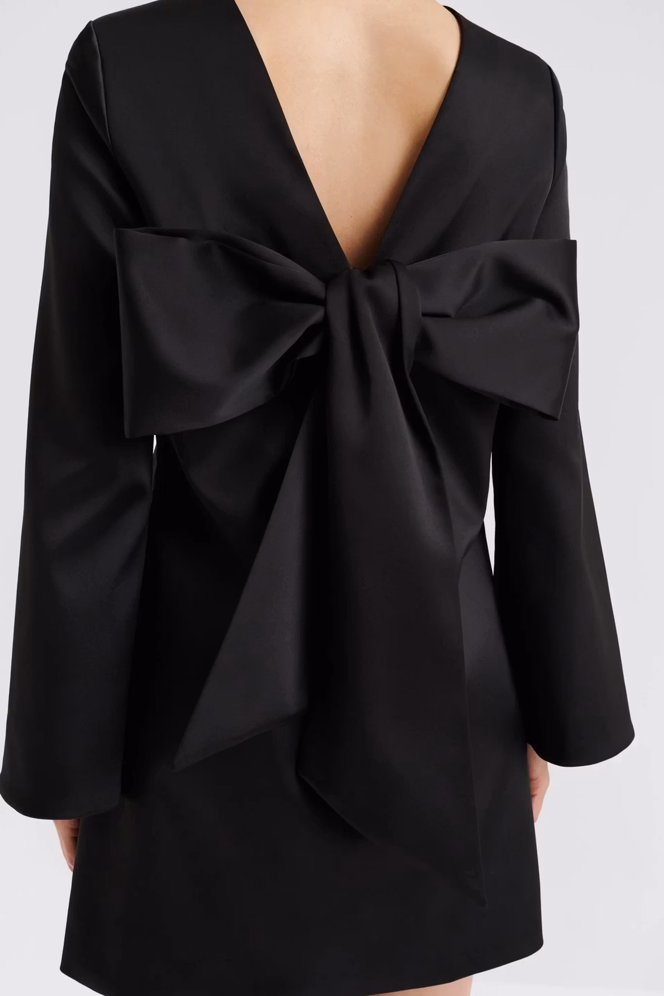 Miniklänning med djup v-ringning i ryggen med rosett-detalj, dold dragkedja i sidan.