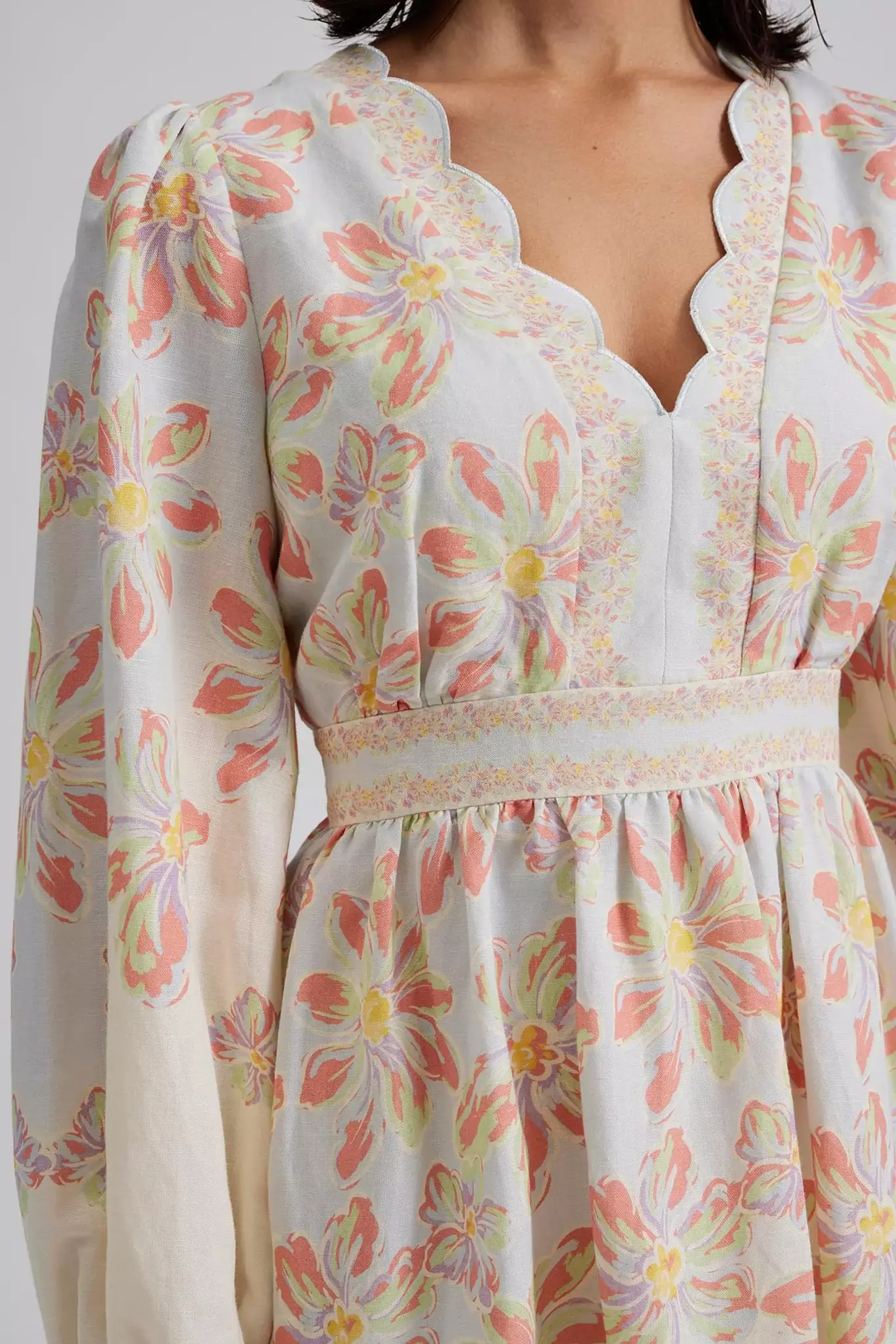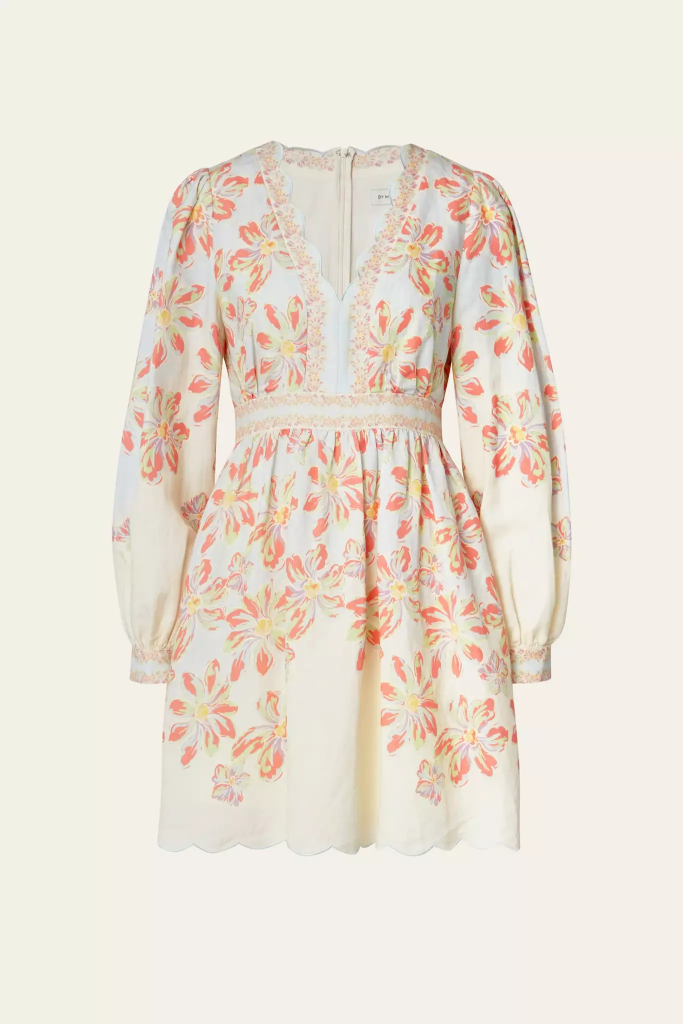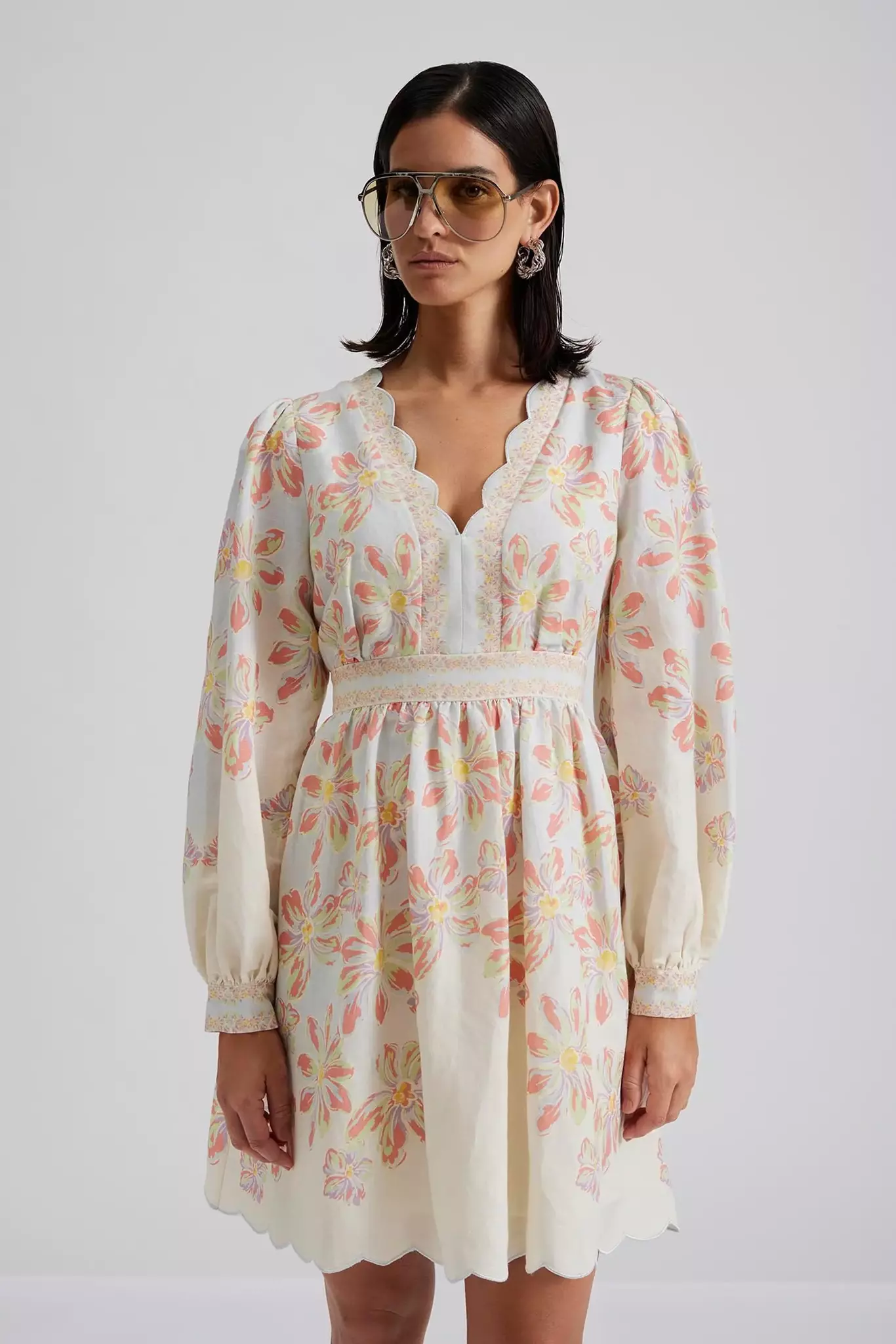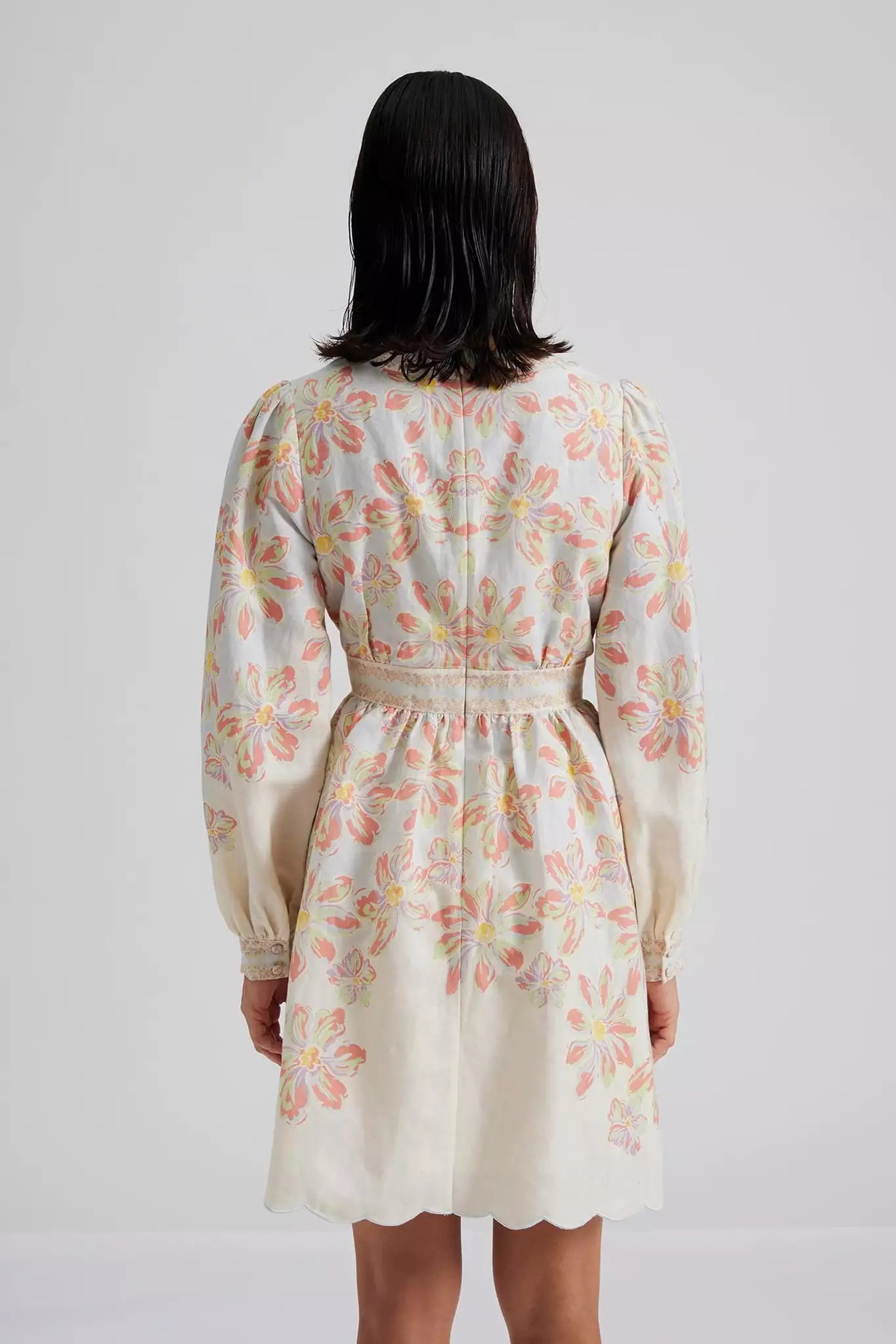 Mönstrad miniklänning med långa ärmar och vågformade detaljer, dold dragkedja i ryggen.