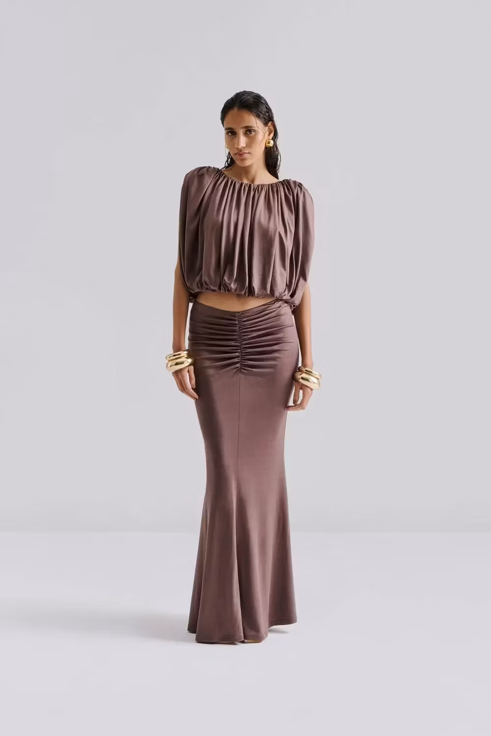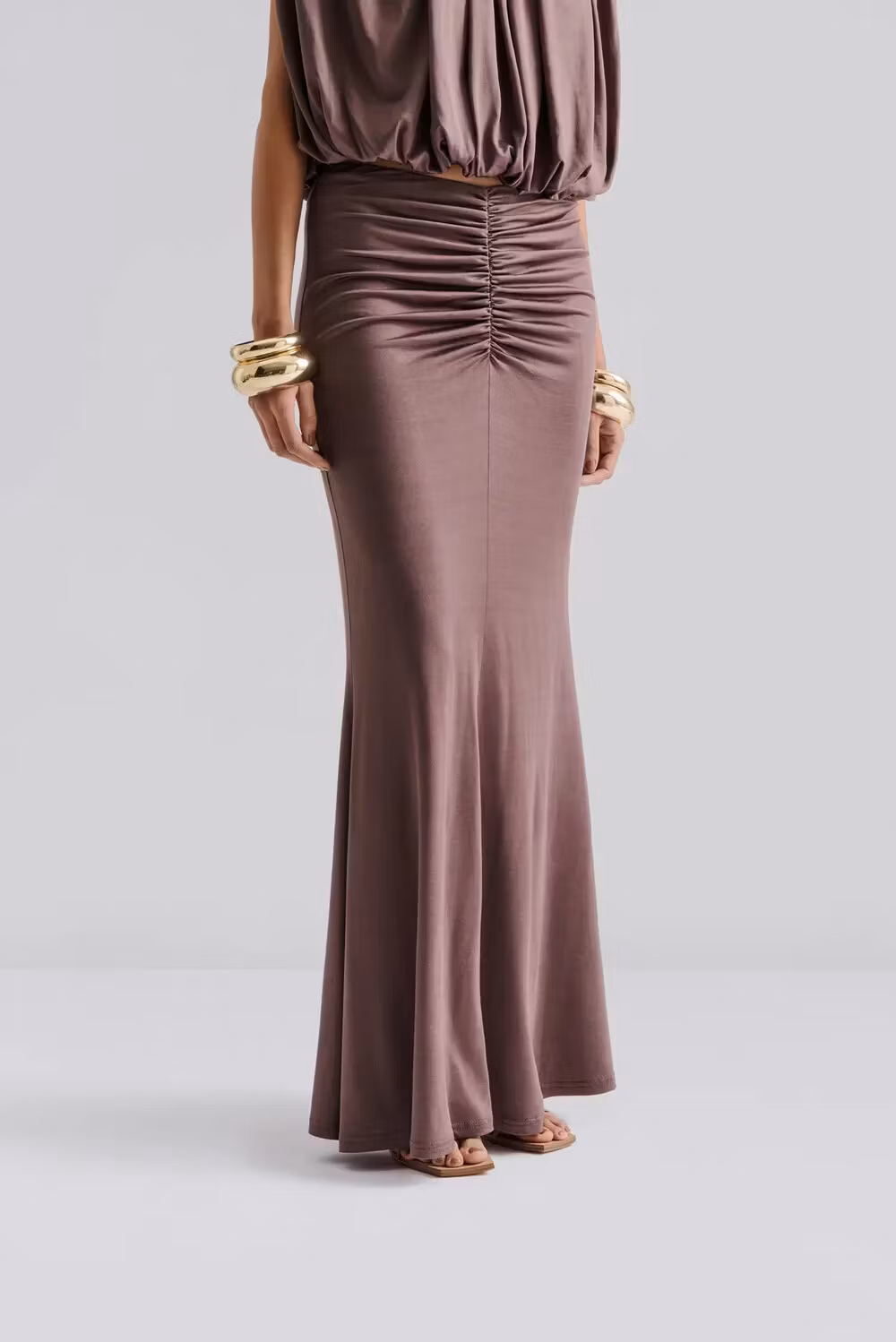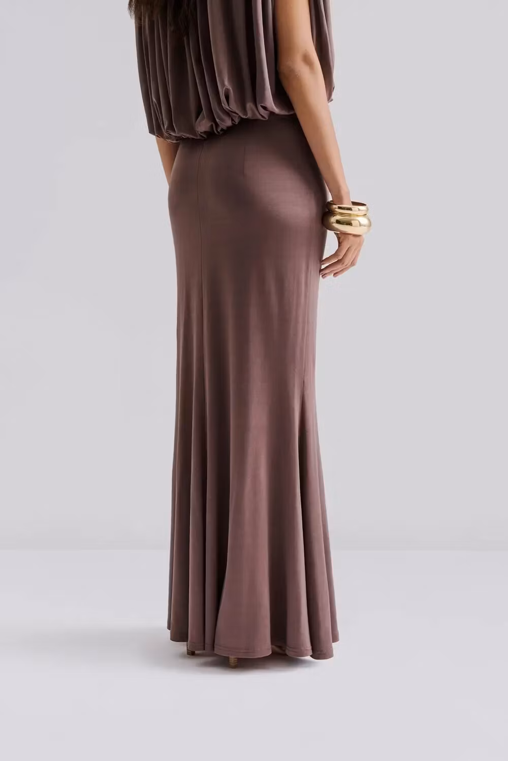 Maxikjol i trikå, drapering och figurnära siluett. Dold dragkedja bak. Normal i storlek.