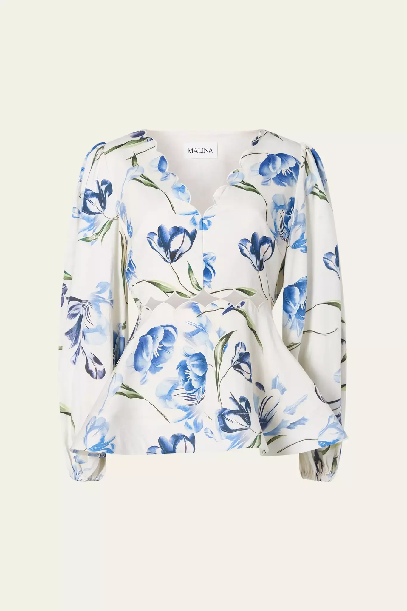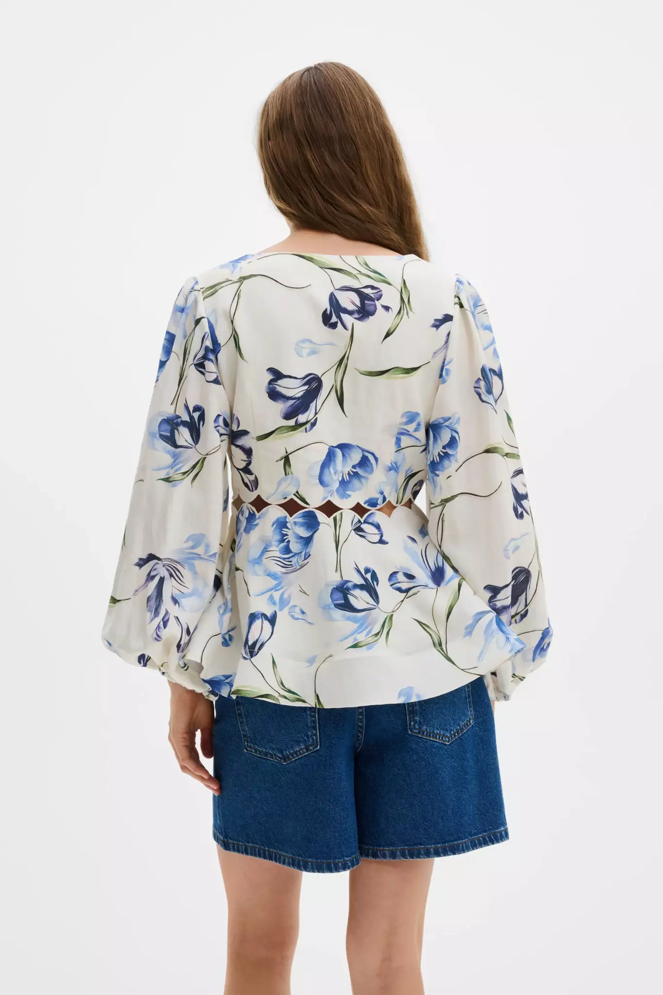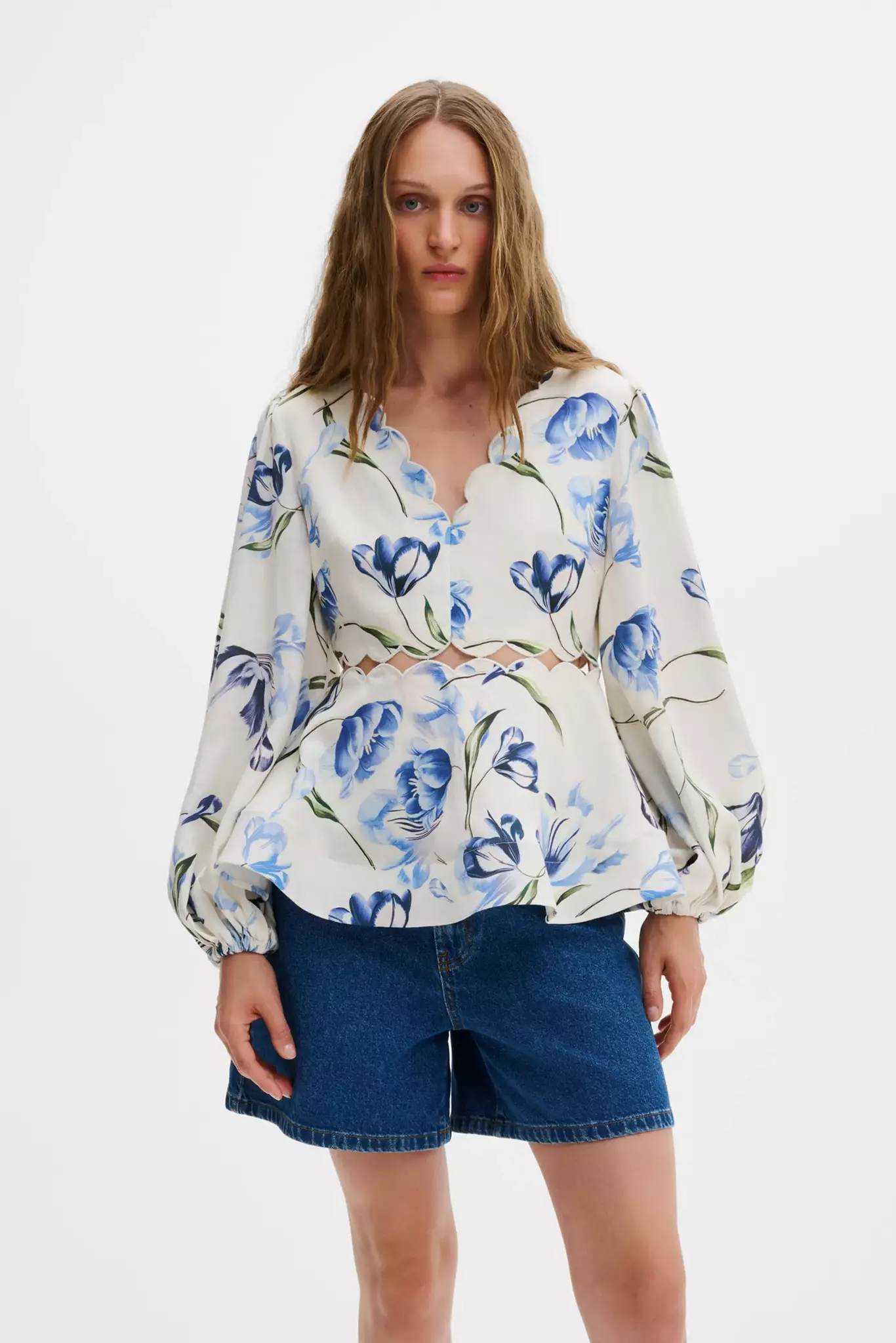 Blus med voluminösa ärmar och cut-out-detaljer, peplumfåll. Liten i storlek.