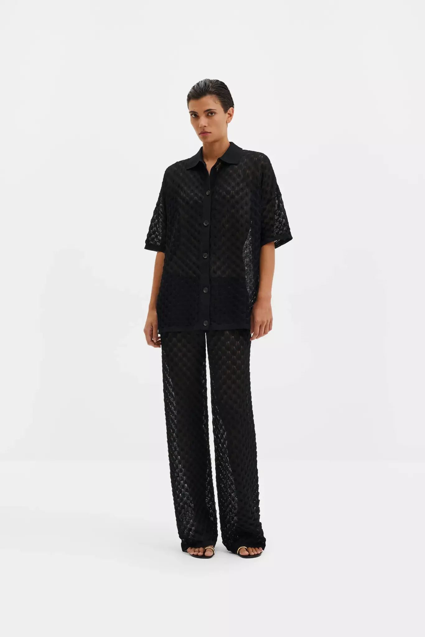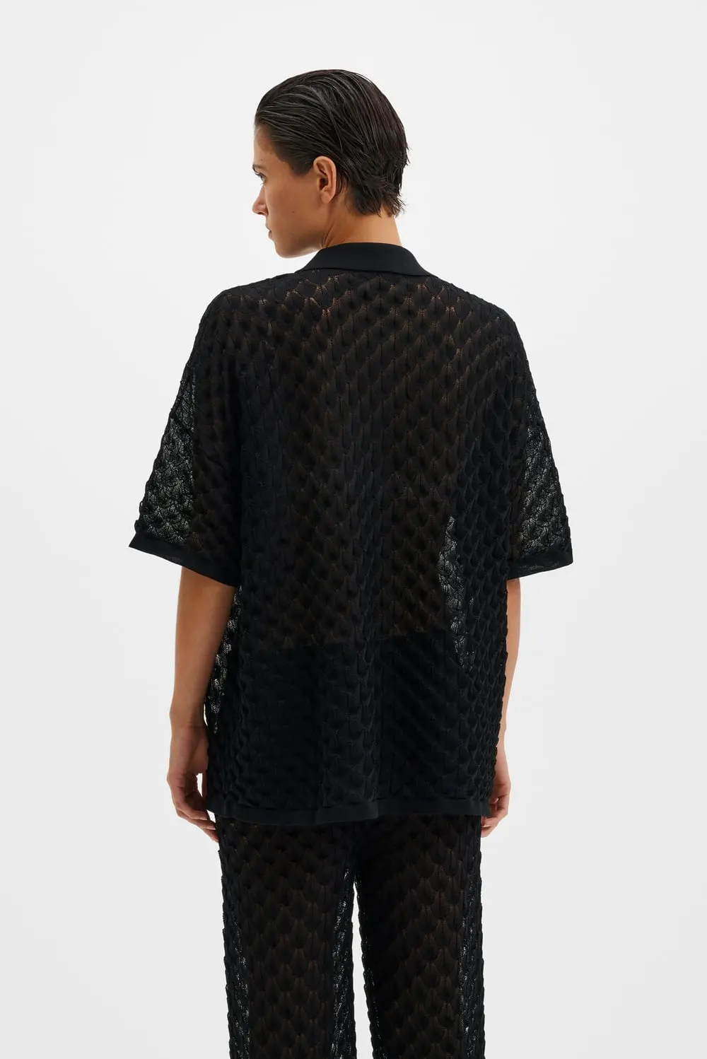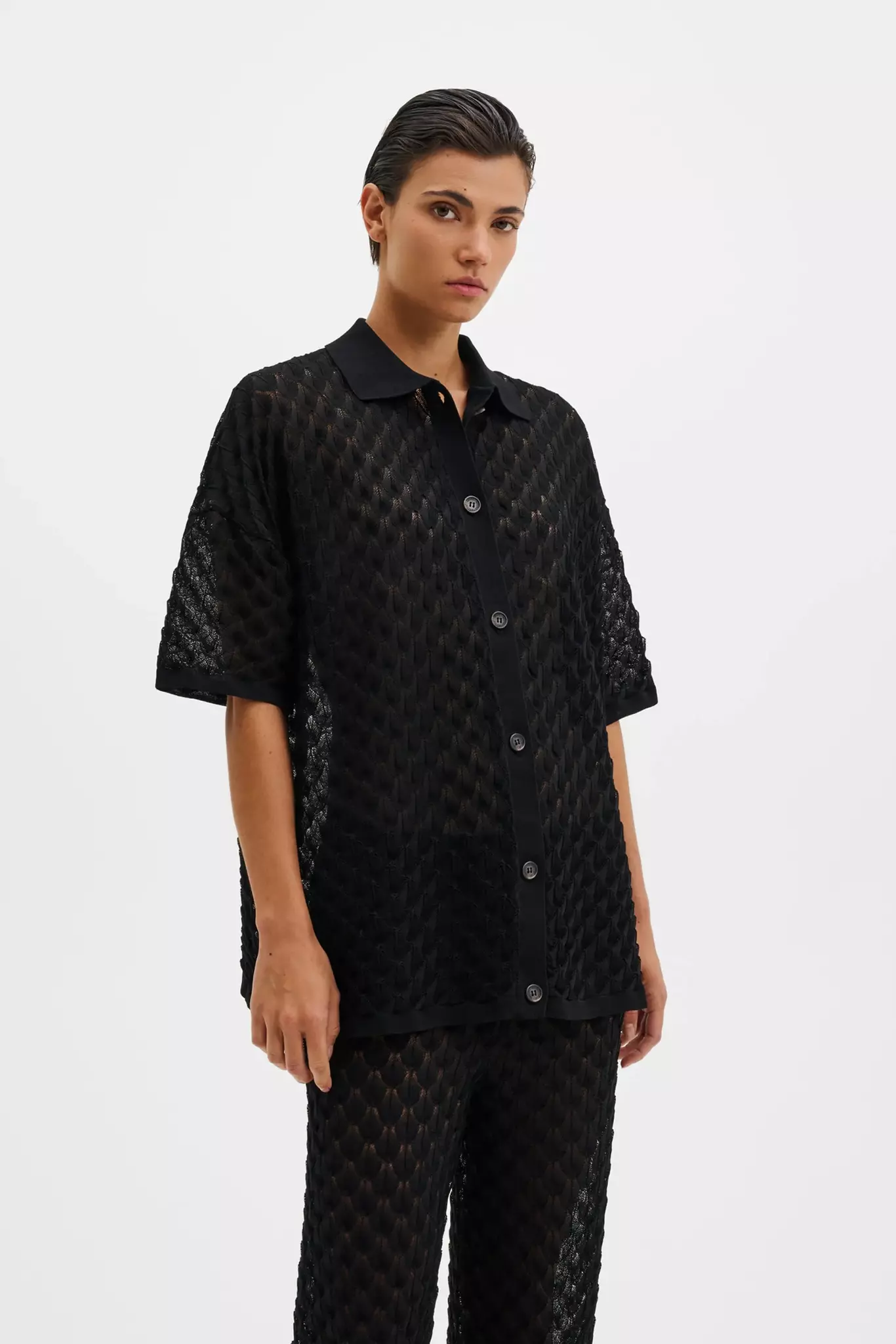 Kortärmad stickad skjorta med knappar framtill.