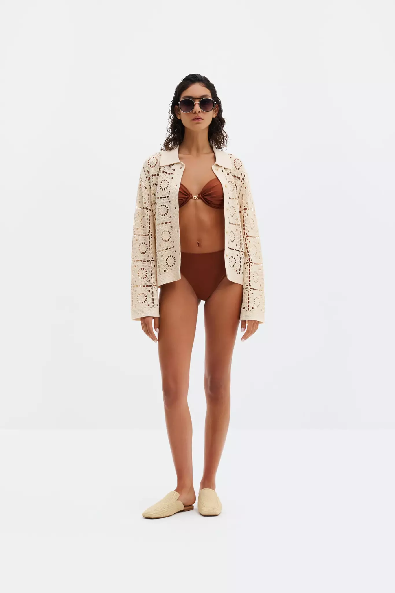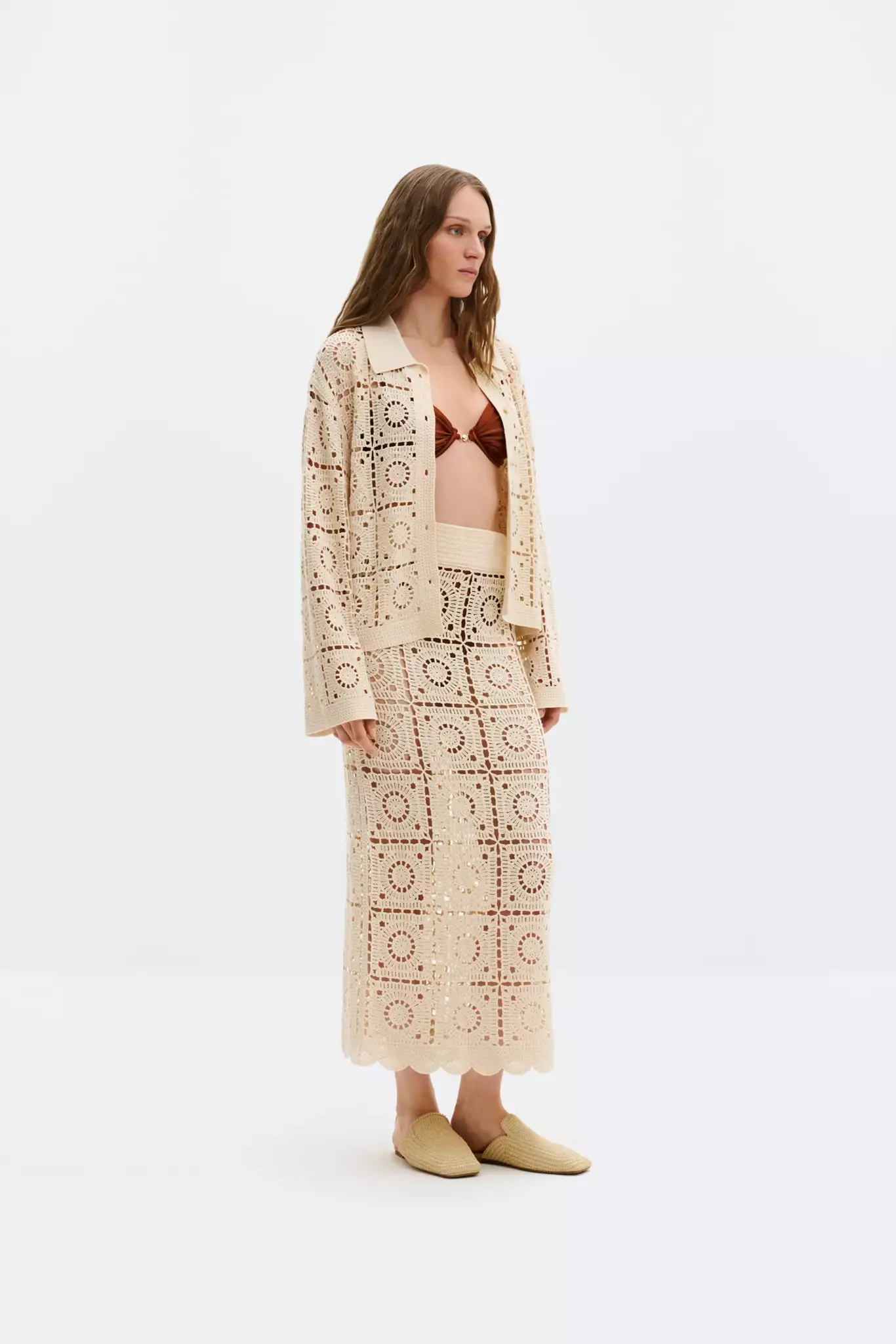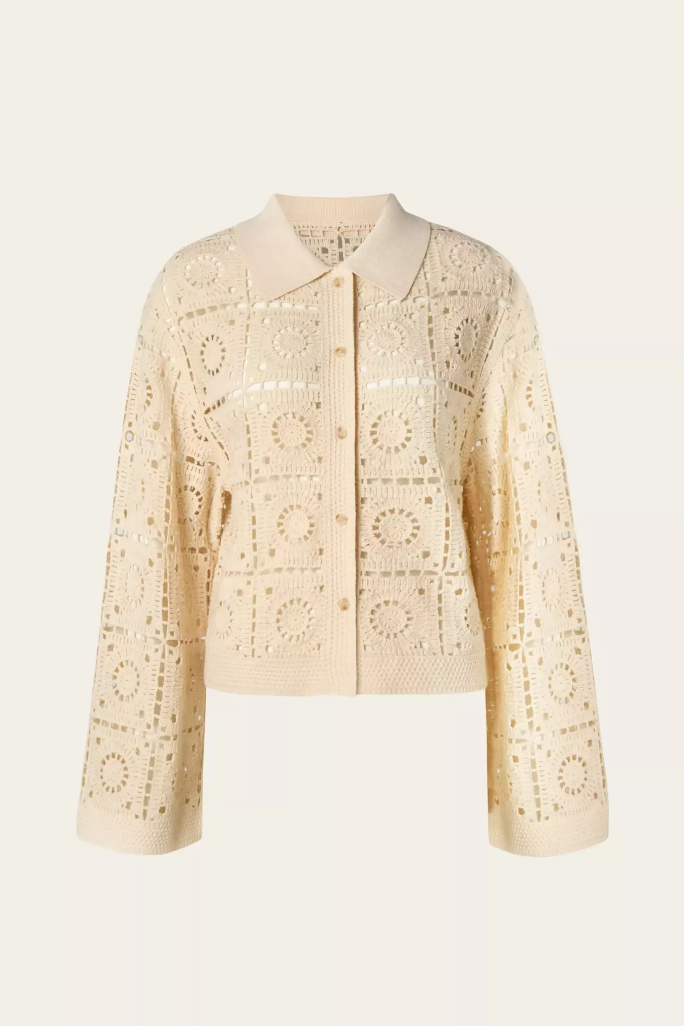 Virkad kofta med vida ärmar och knappar fram. Normal i storlek.