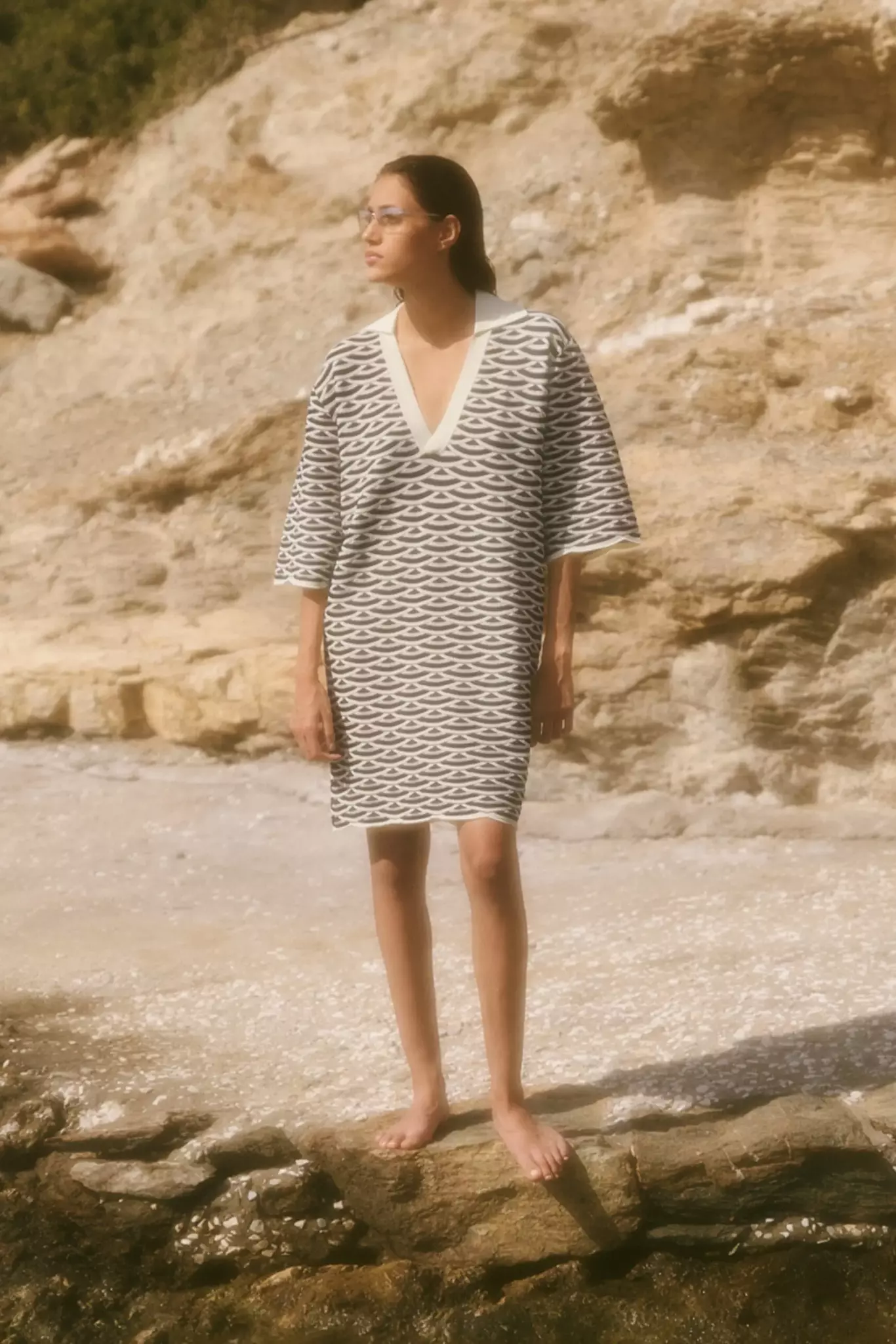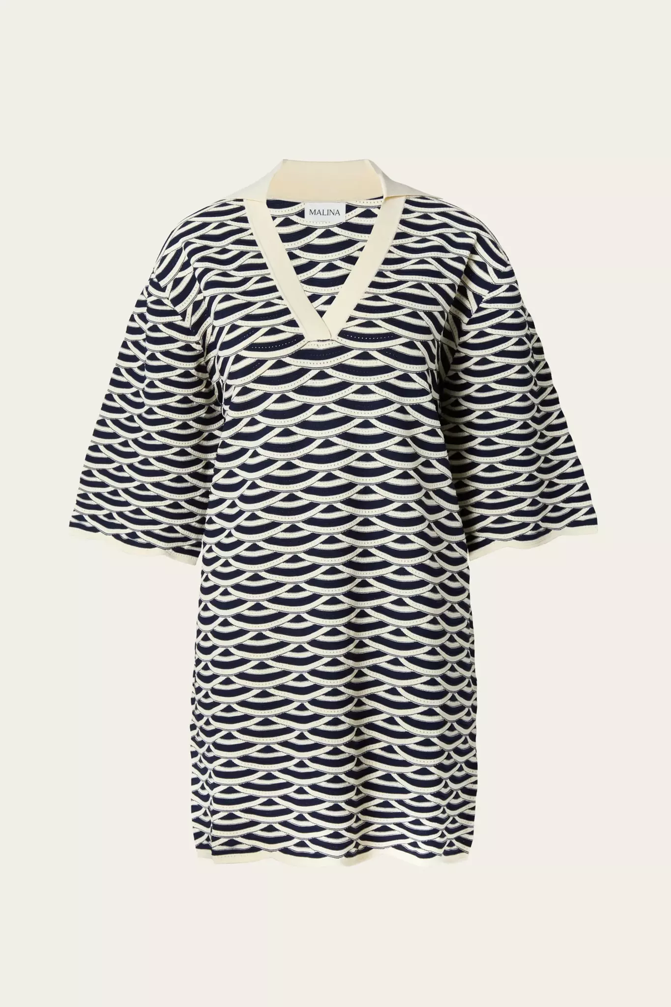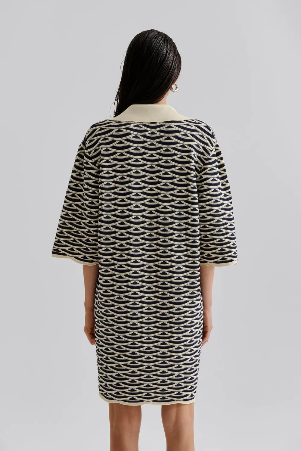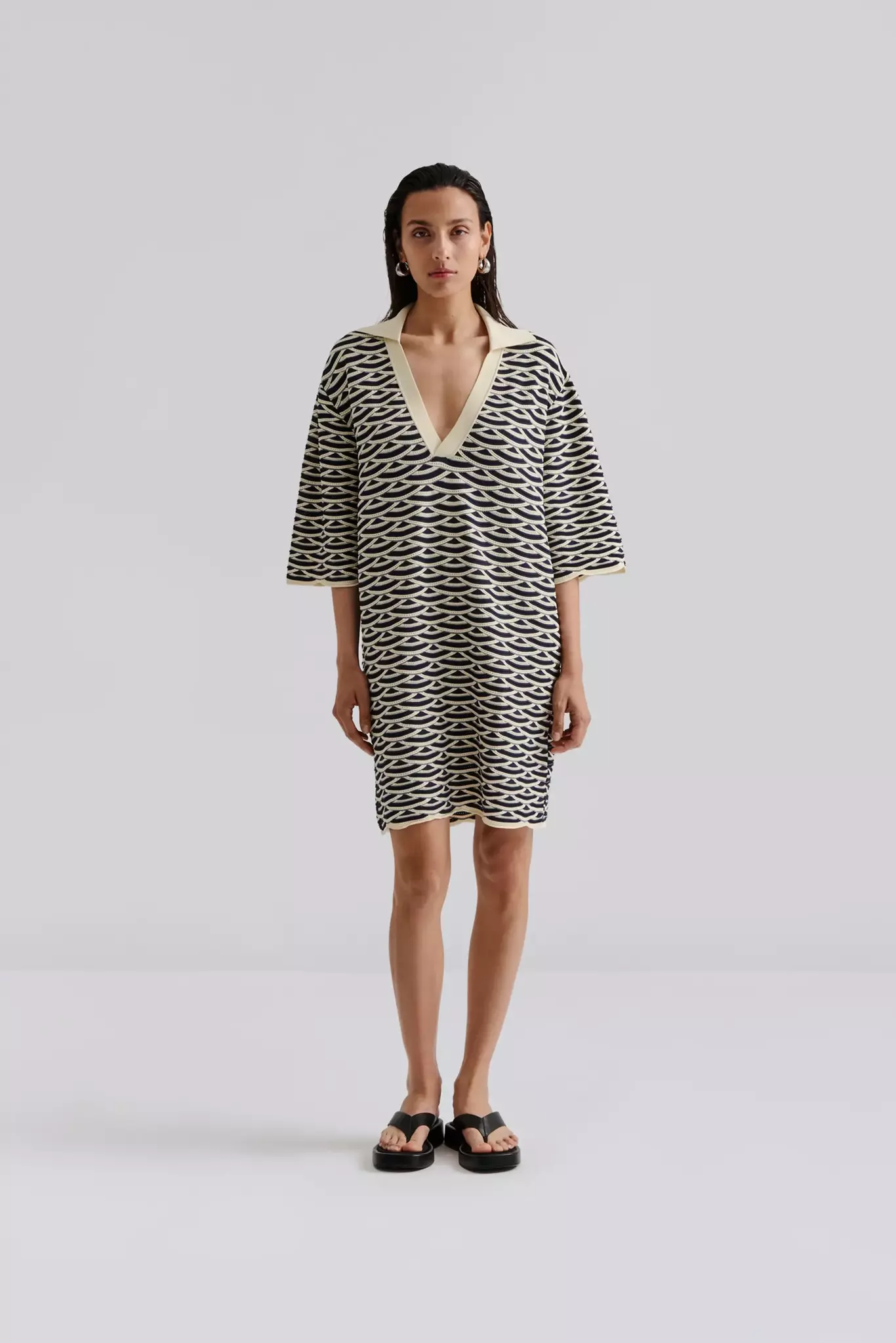 Stickad miniklänning med v-ringning och kort ärm. Normal i storlek.