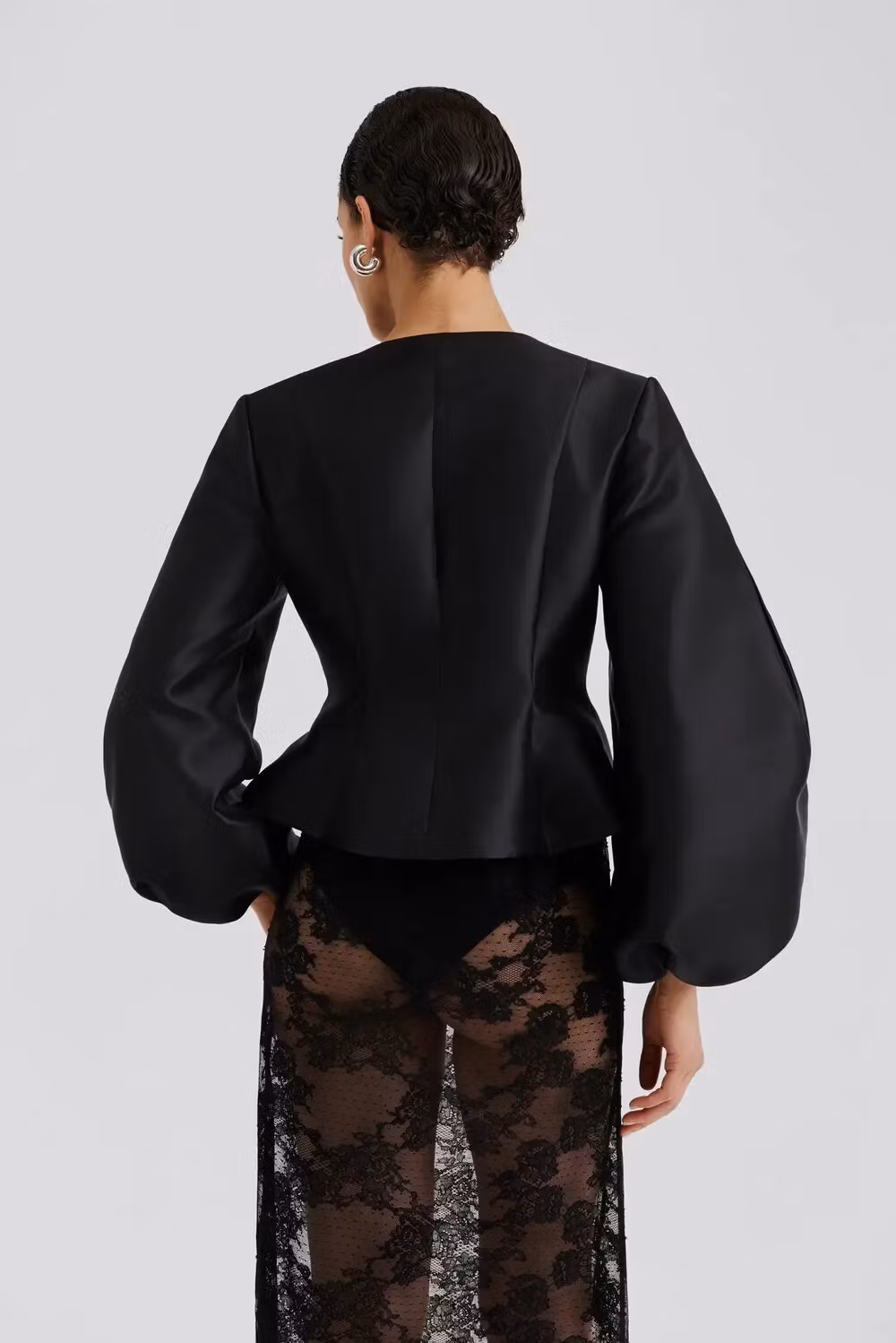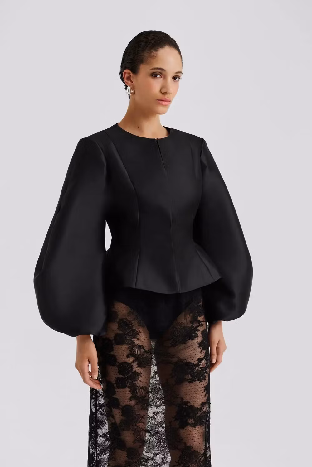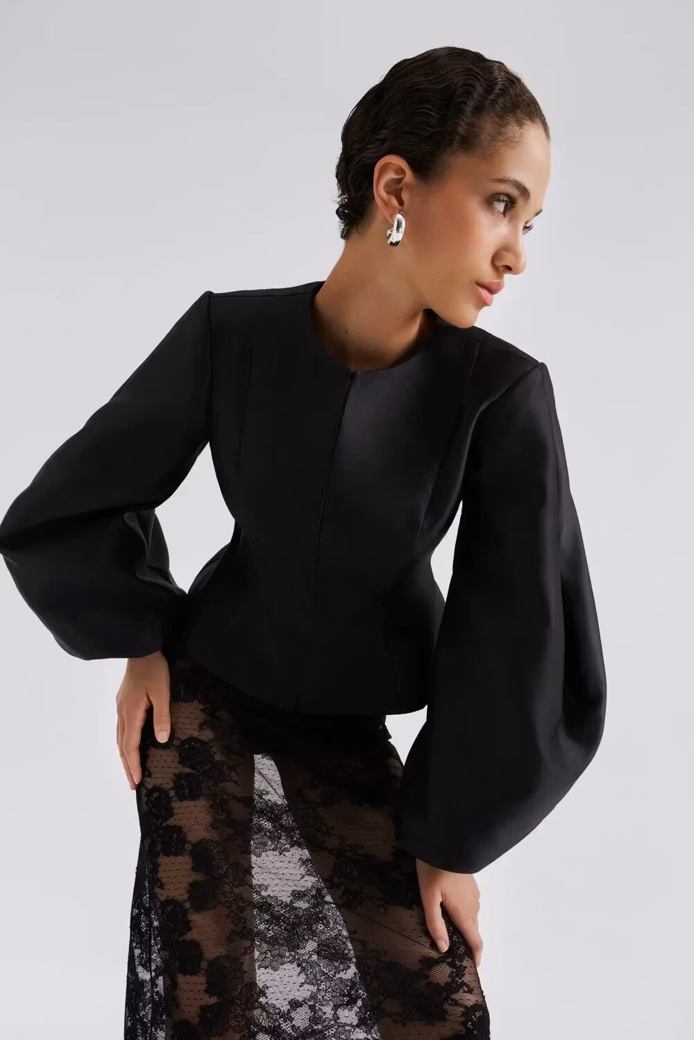 Blus med peplumsiluett och voluminös ärm. Dolda hyskor fram, markerad midja.