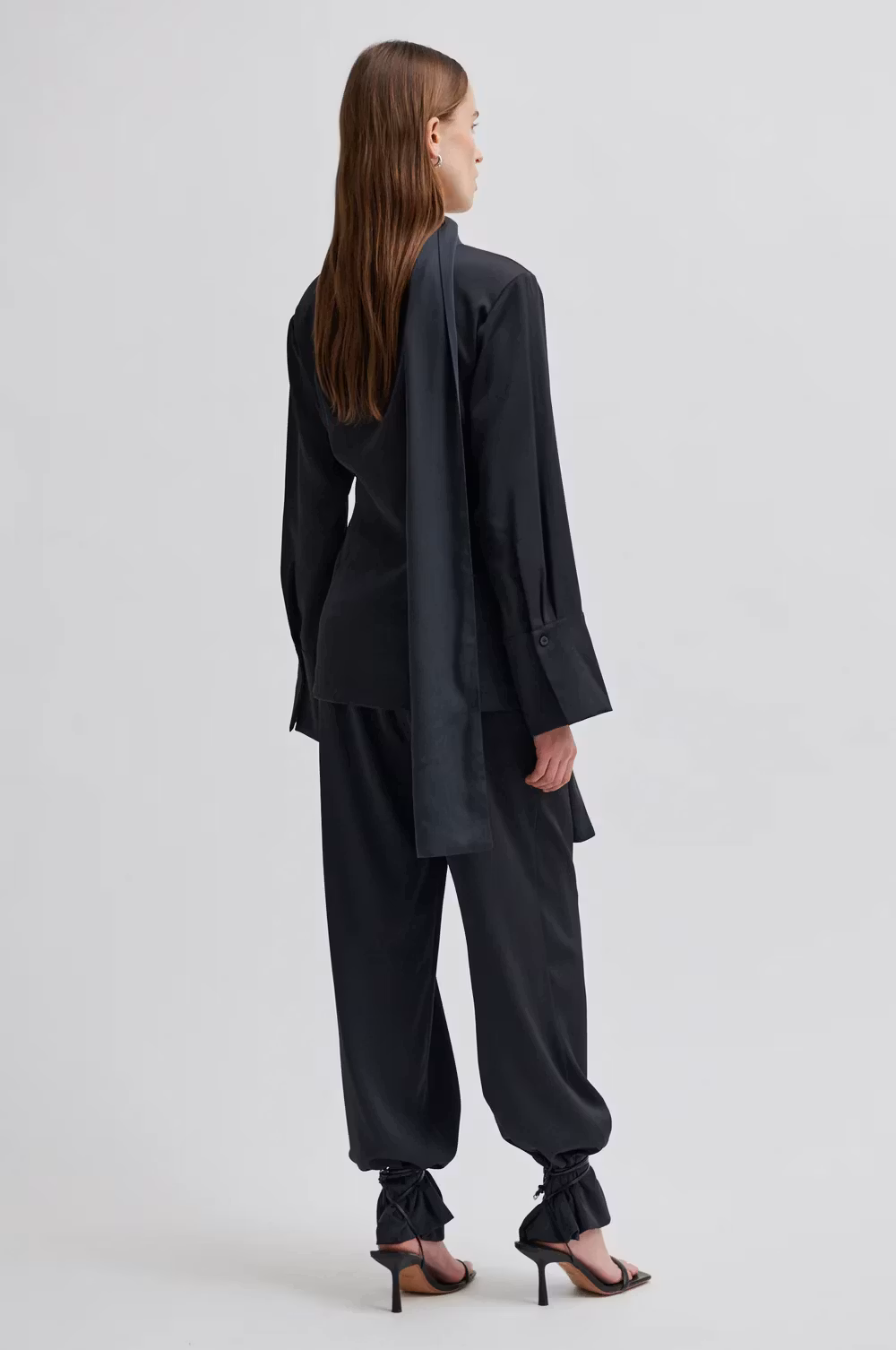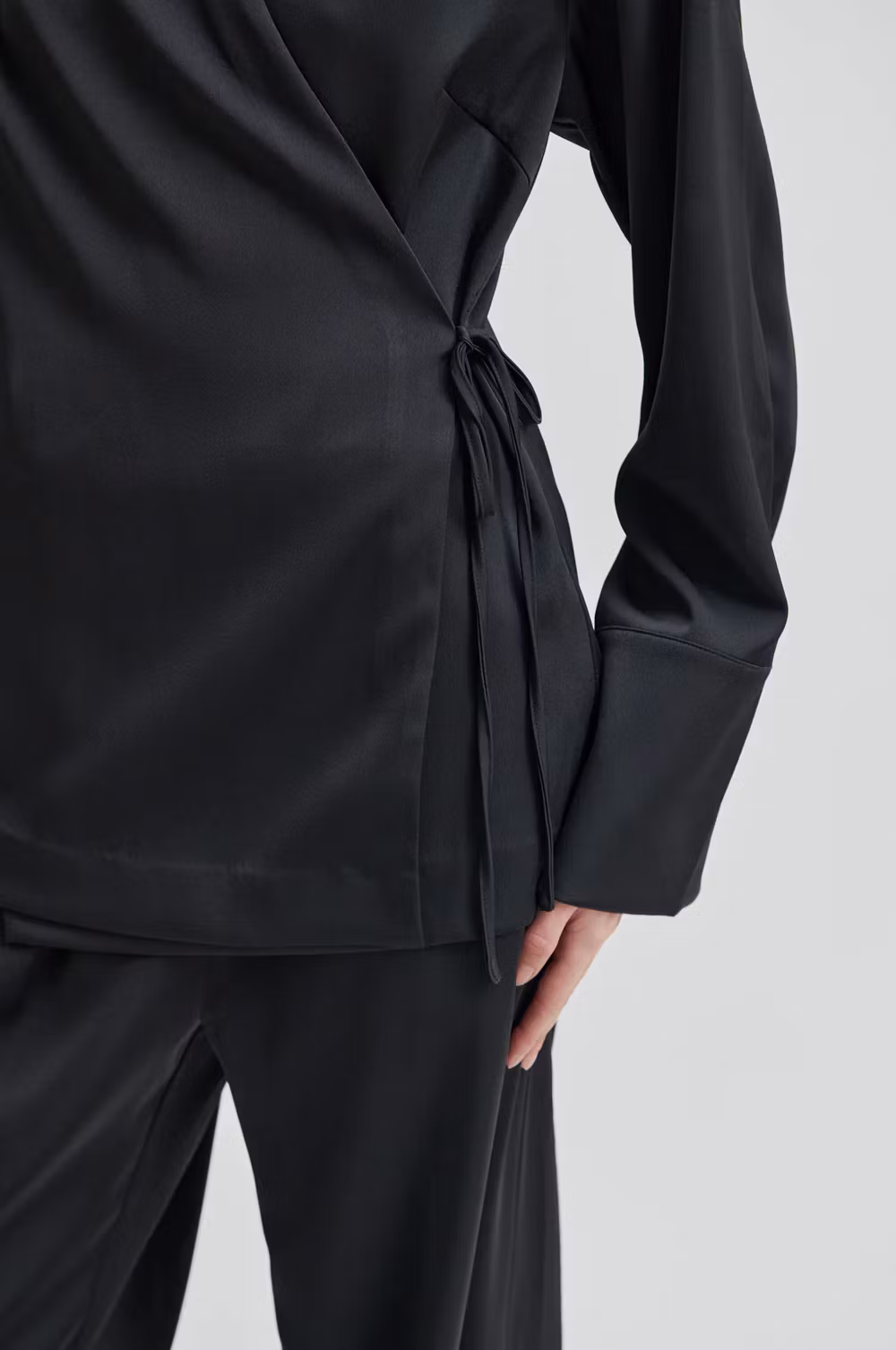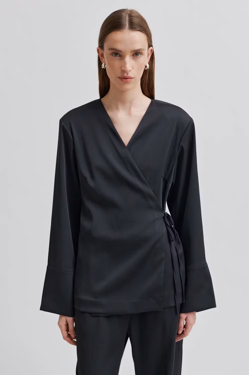 Omlott blus med knyt, avtagbara axelvaddar. Vida ärmar med knapp.