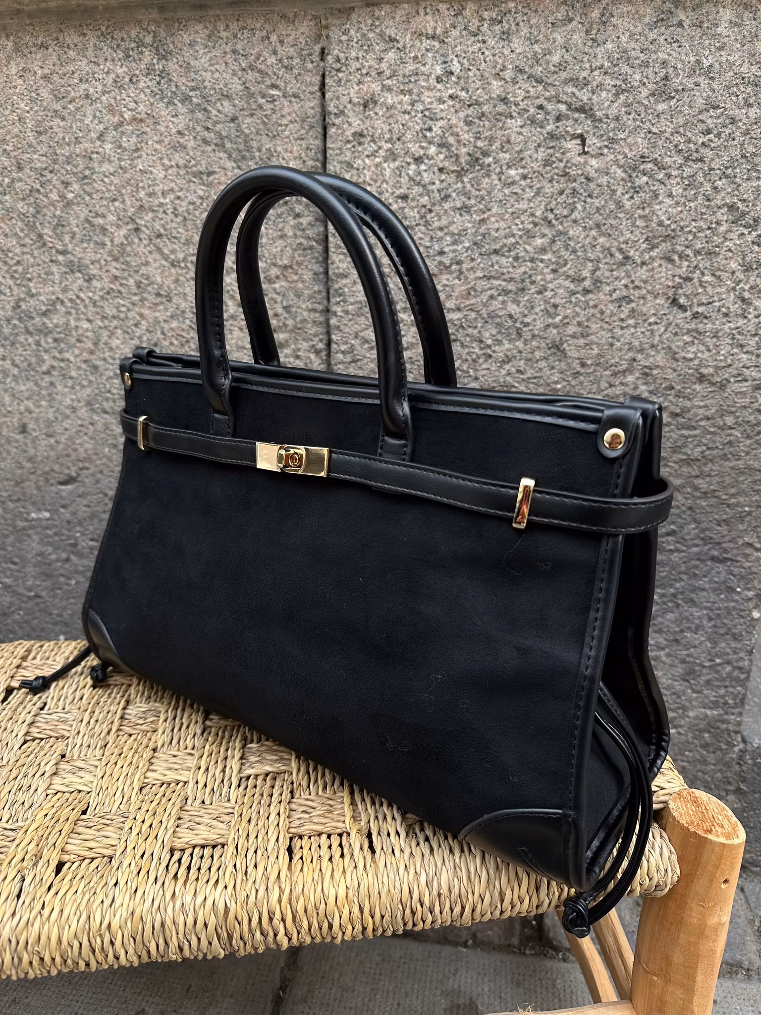 Väska i mockaimitation med bälte och gulddetaljer. Längre band medföljer.