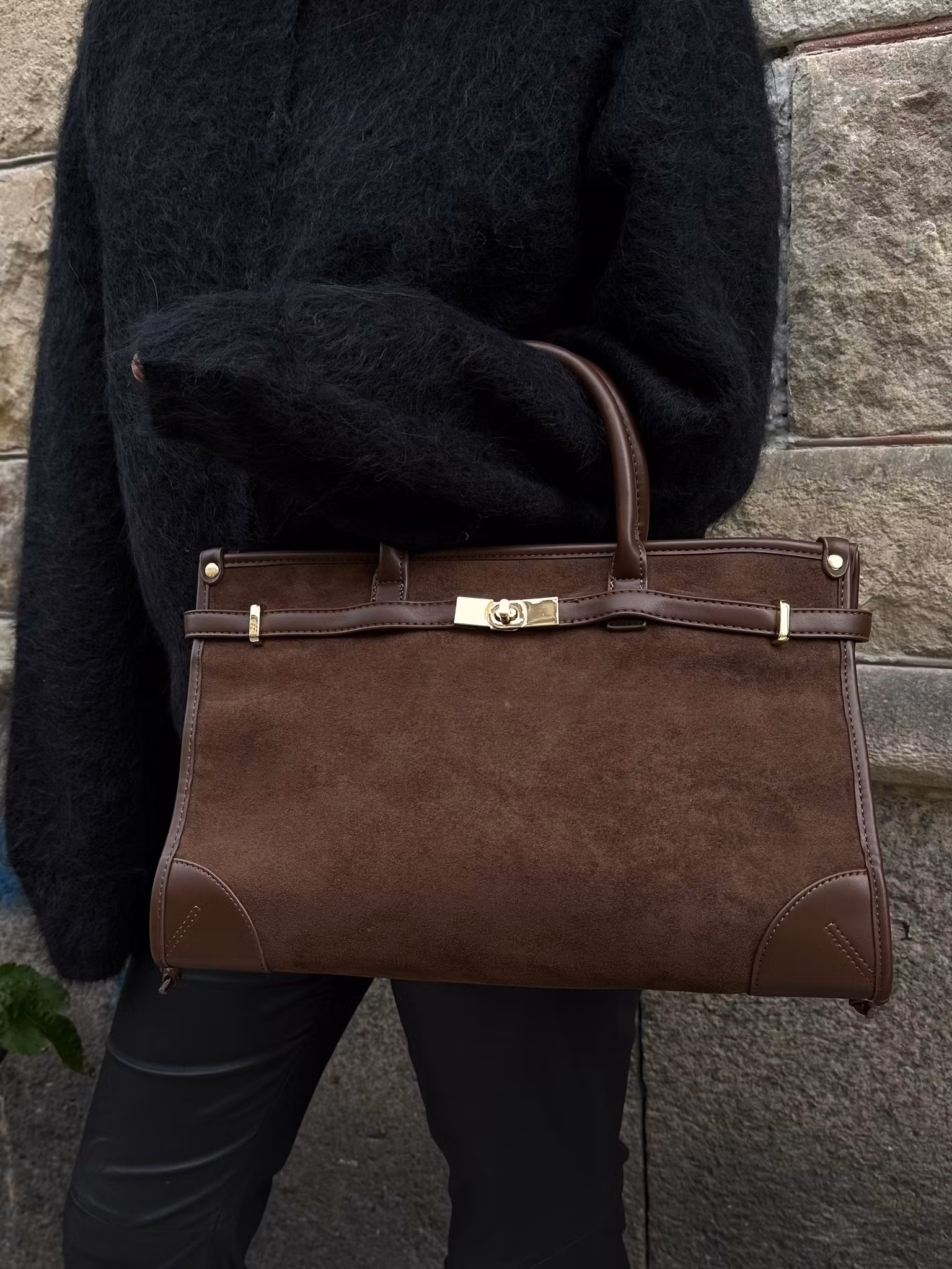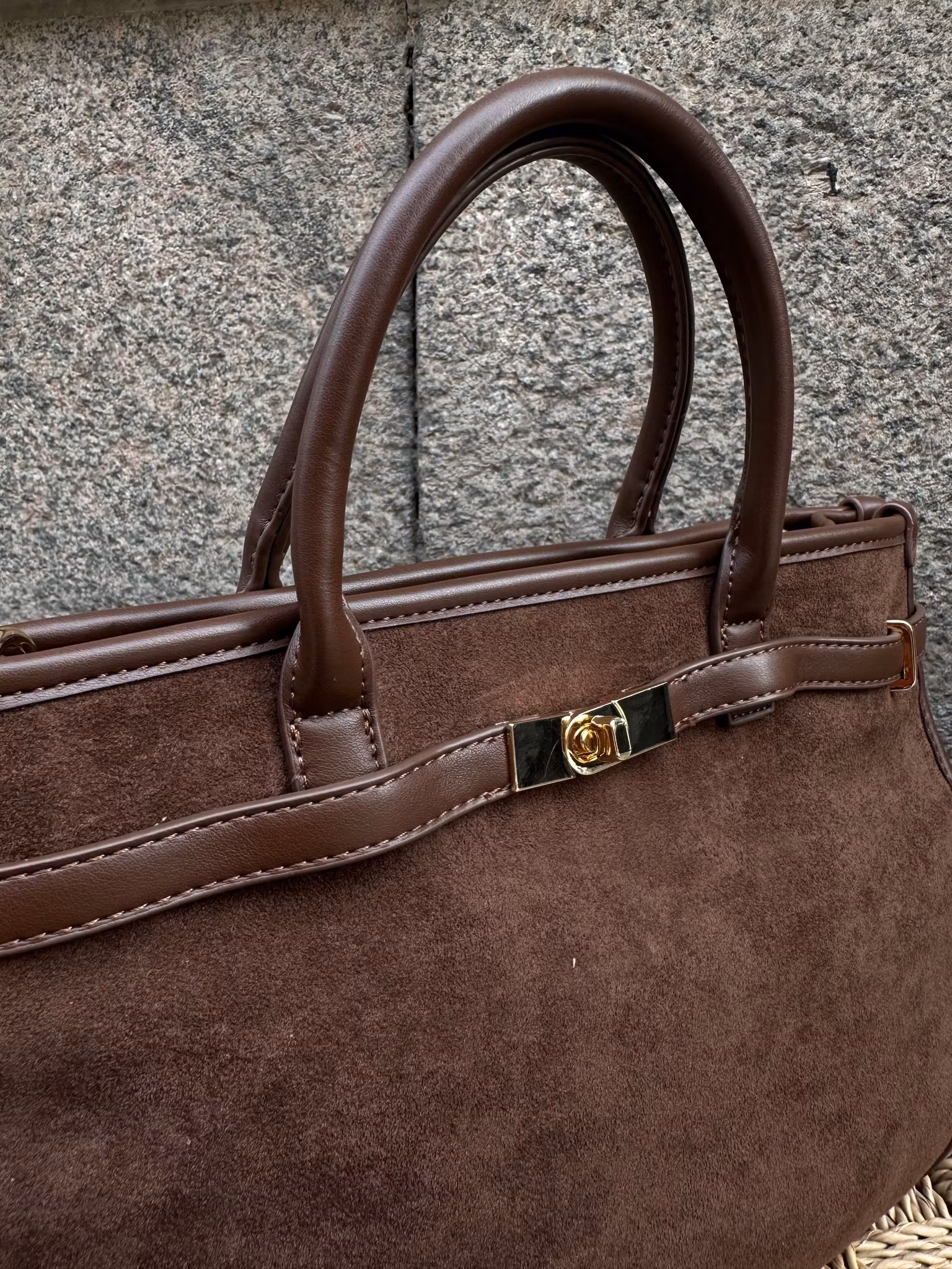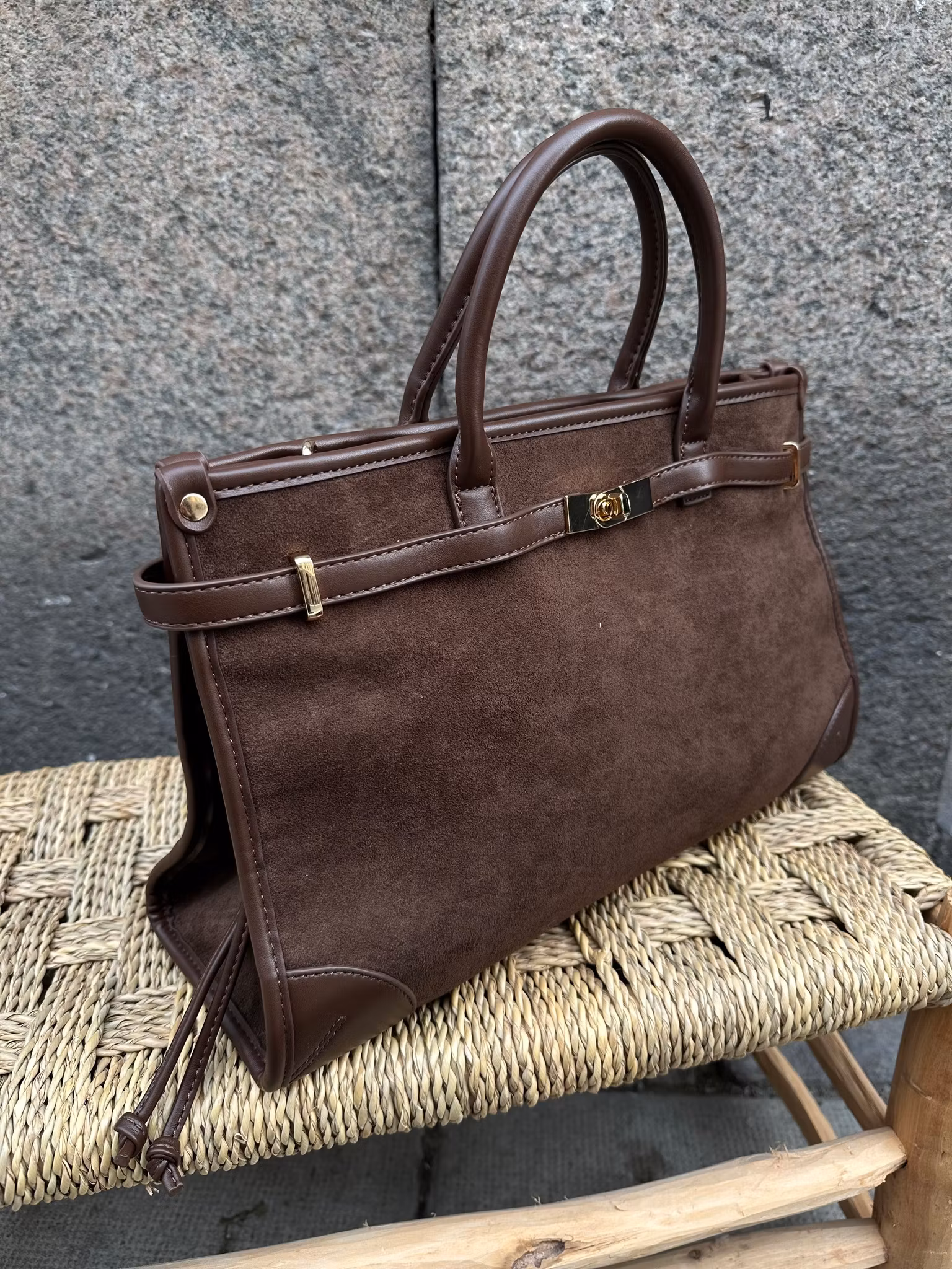 Väska i mockaimitation med bälte och gulddetaljer. Längre band medföljer.