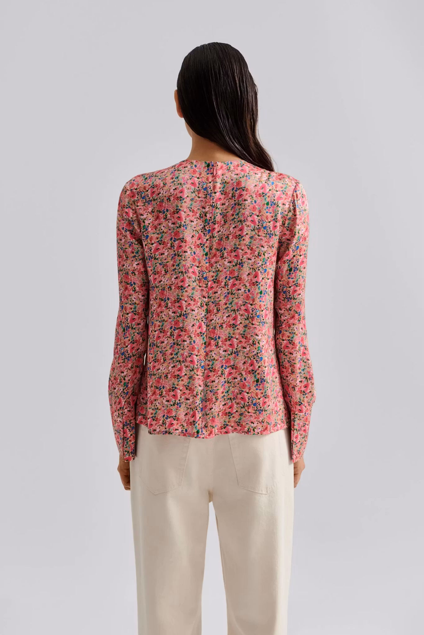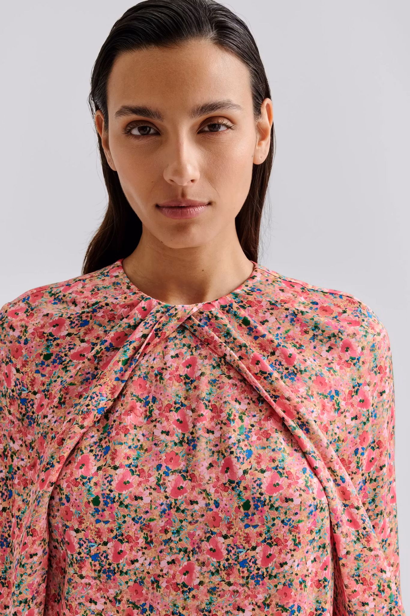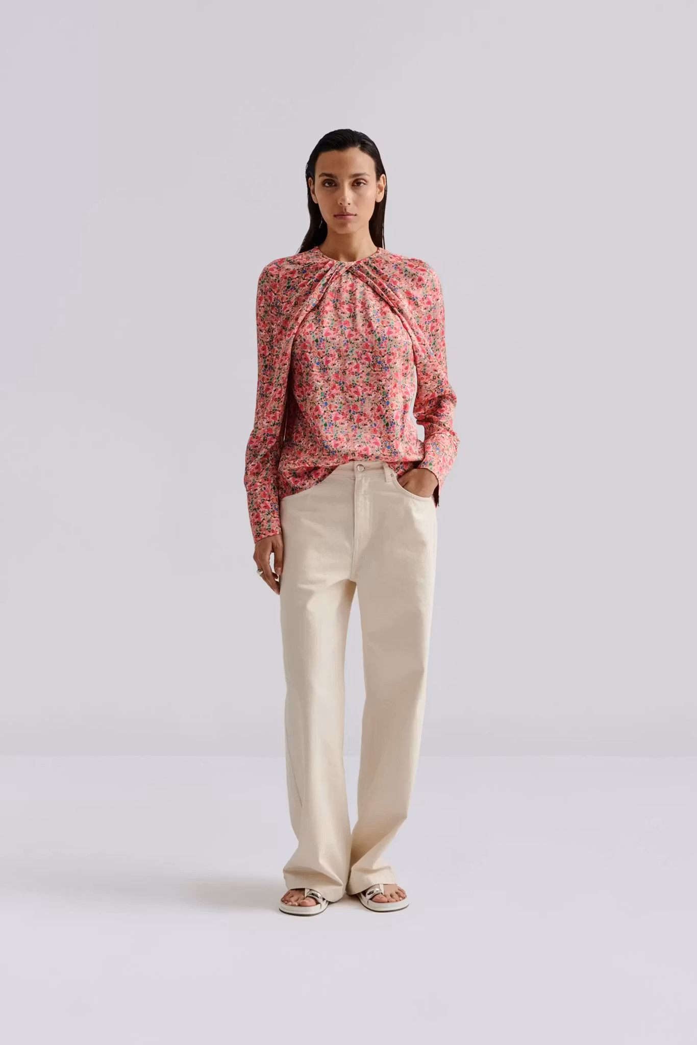 Blus i lös passform med veckad halsringning och vid ärm.