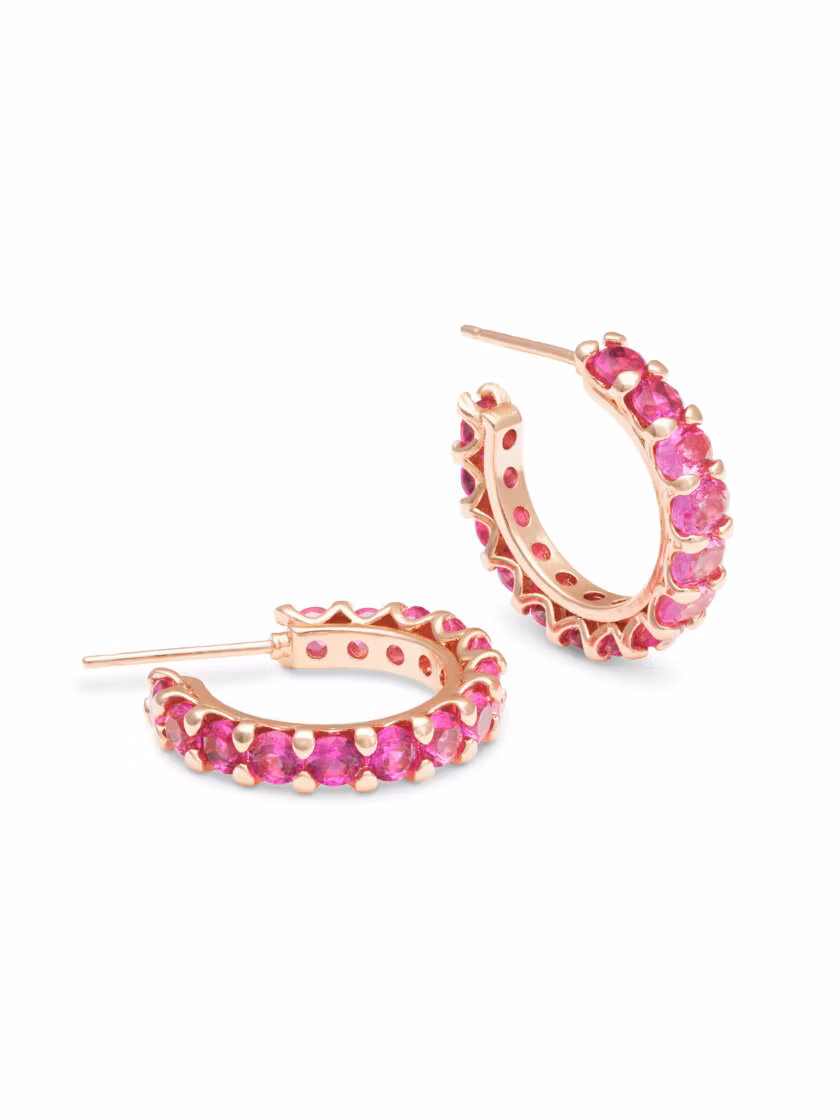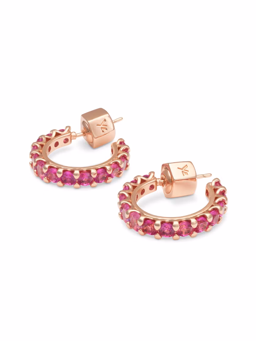 Instantly eye-catching, these stunning hoop earrings with a combination of ruby pink-coloured princess-cut oval stones and round crystals, inlaid in claws of plated rose gold can be dressed up or down.