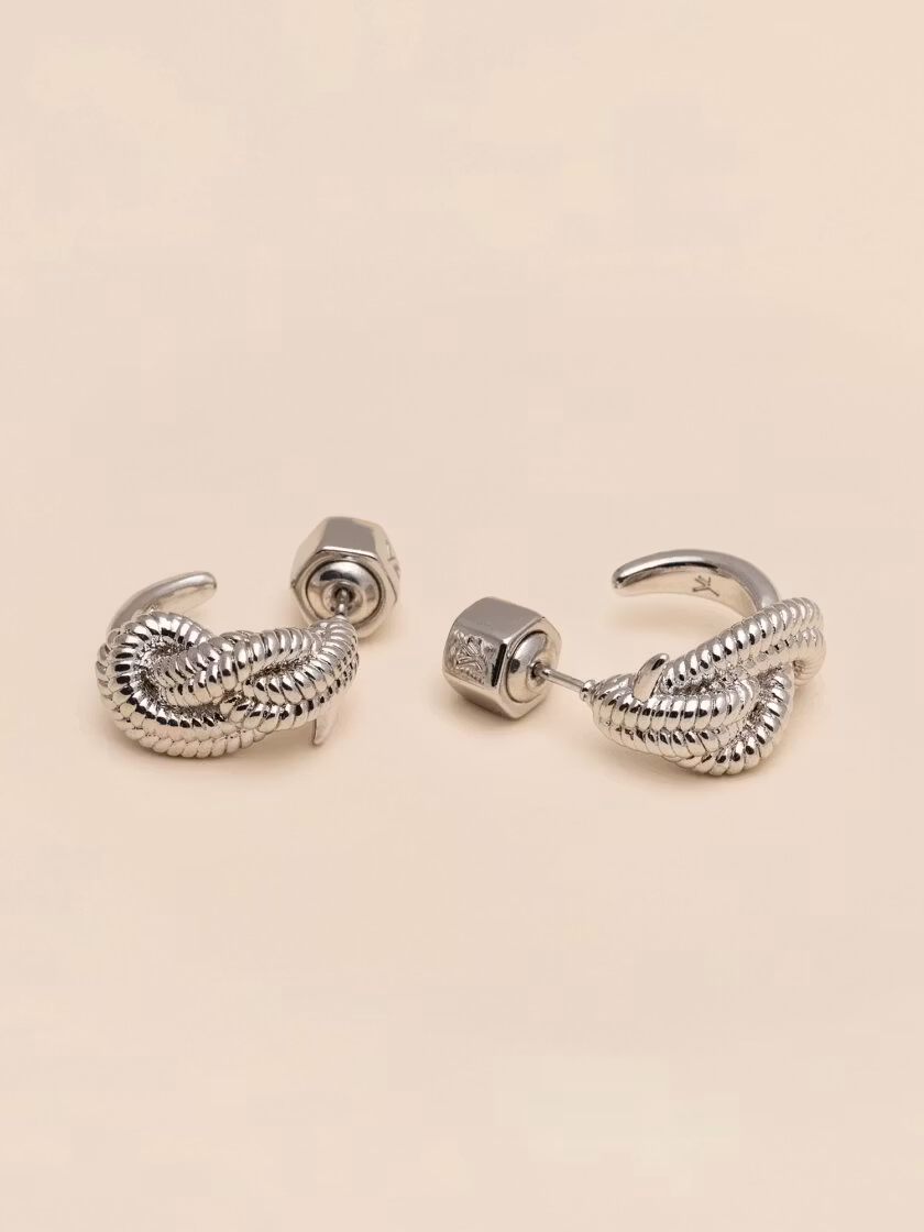 These handmade rhodium plated earrings are the embodiment of an artistic soul. Through the motif of a rope-twisted knot, we created these unique earrings. Match with Yves knot ring.