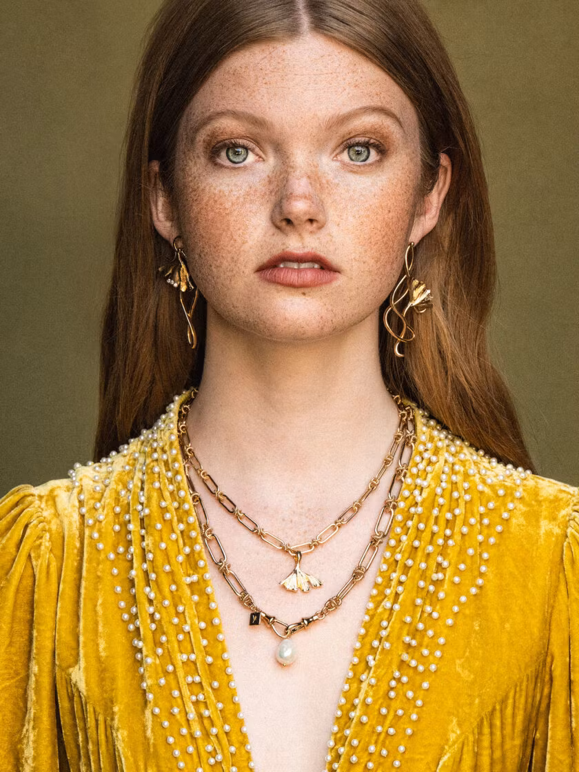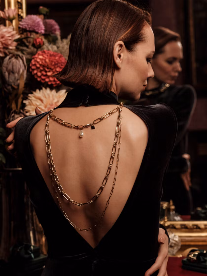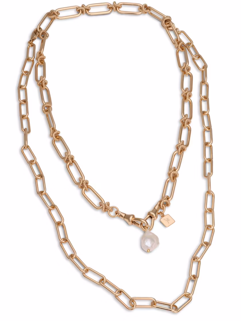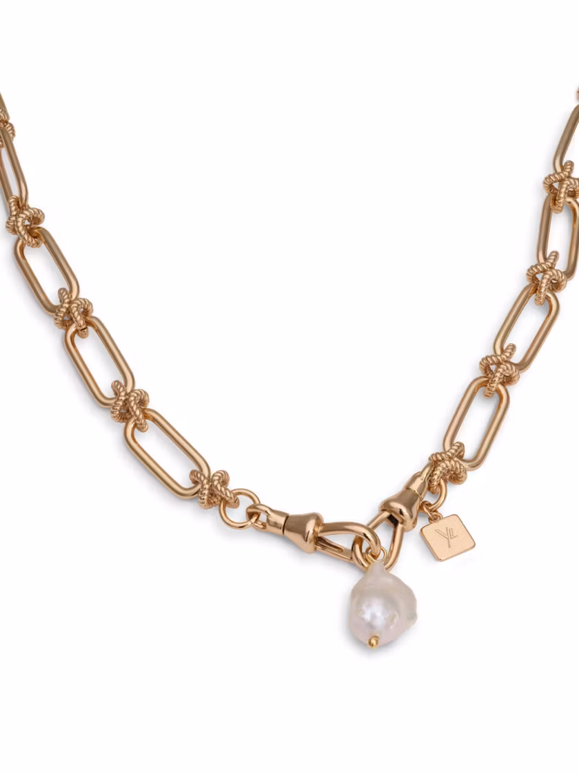 Our signature necklace, the effortlessly stylish and versatile- Yves. Bound together by small knots of gold-plated rope, each chain loops to create a multi-layered necklace that is edgy, yet feminine, and most definitley will get everyone talking. A single baroque pearl hangs alongside the Ylva Li branded charm from the centre chain. Stack it, join it, wear it solo, depending on your unique style.
